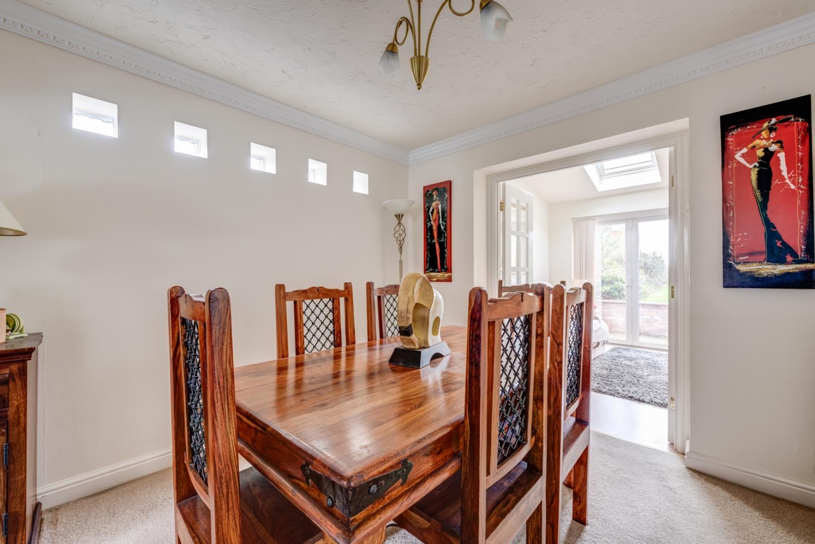 The dining kitchen is a bright, contemporary space with cream cabinetry and dark work surfaces that contrast beautifully with the pale wooden-style flooring. A skylight and window bring in plenty of natural light, accentuating the clean, modern layout. Integrated appliances, including an oven, fridge, freezer, dishwasher, washing machine and microwave, add convenience, and there is ample room for a dining table, making it perfect for relaxed family meals.