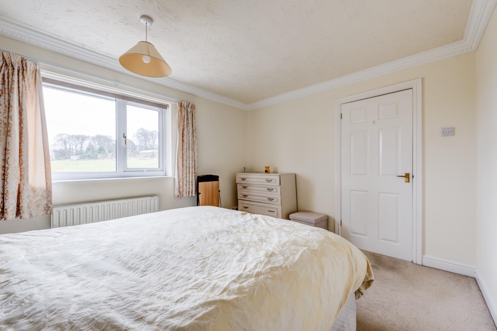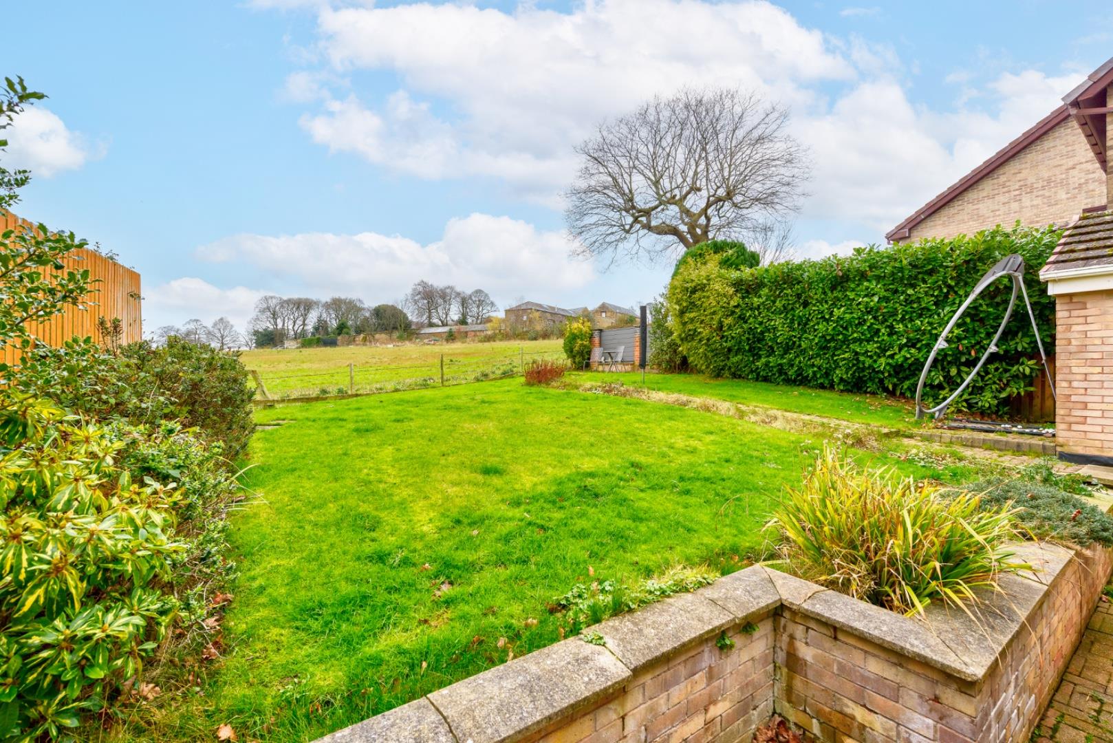 The rear garden is a generous, well-maintained lawn bordered by mature shrubbery and fencing to ensure privacy. Beyond the garden, the property enjoys open views over rolling countryside, adding to the sense of space and tranquility. There is a paved path and a brick retaining wall that add structure and ease of maintenance to the outdoor space.