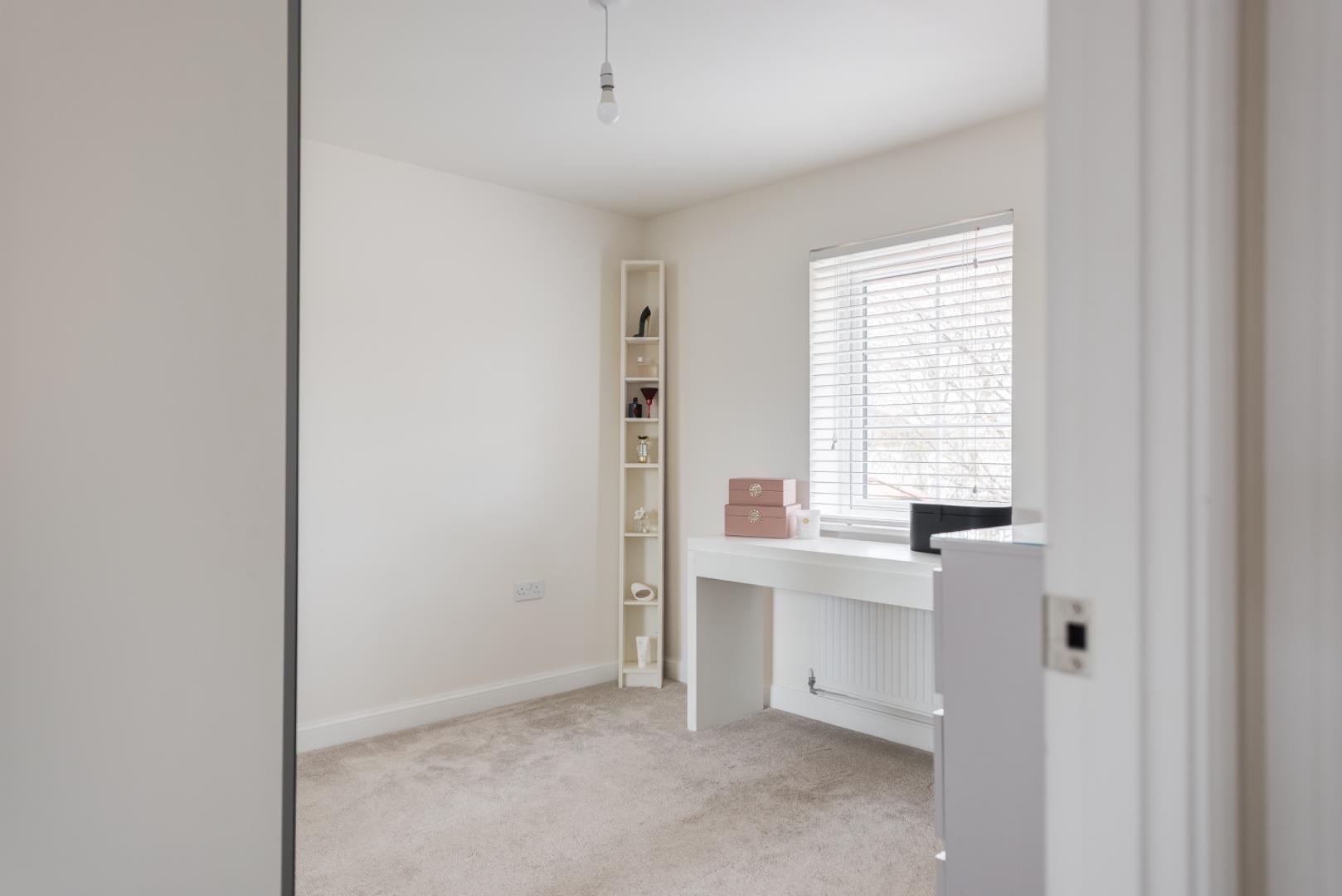 This fourth bedroom is a compact room, suitable as a single bedroom or study, featuring neutral tones and carpeting. A window provides natural light from the side aspect.