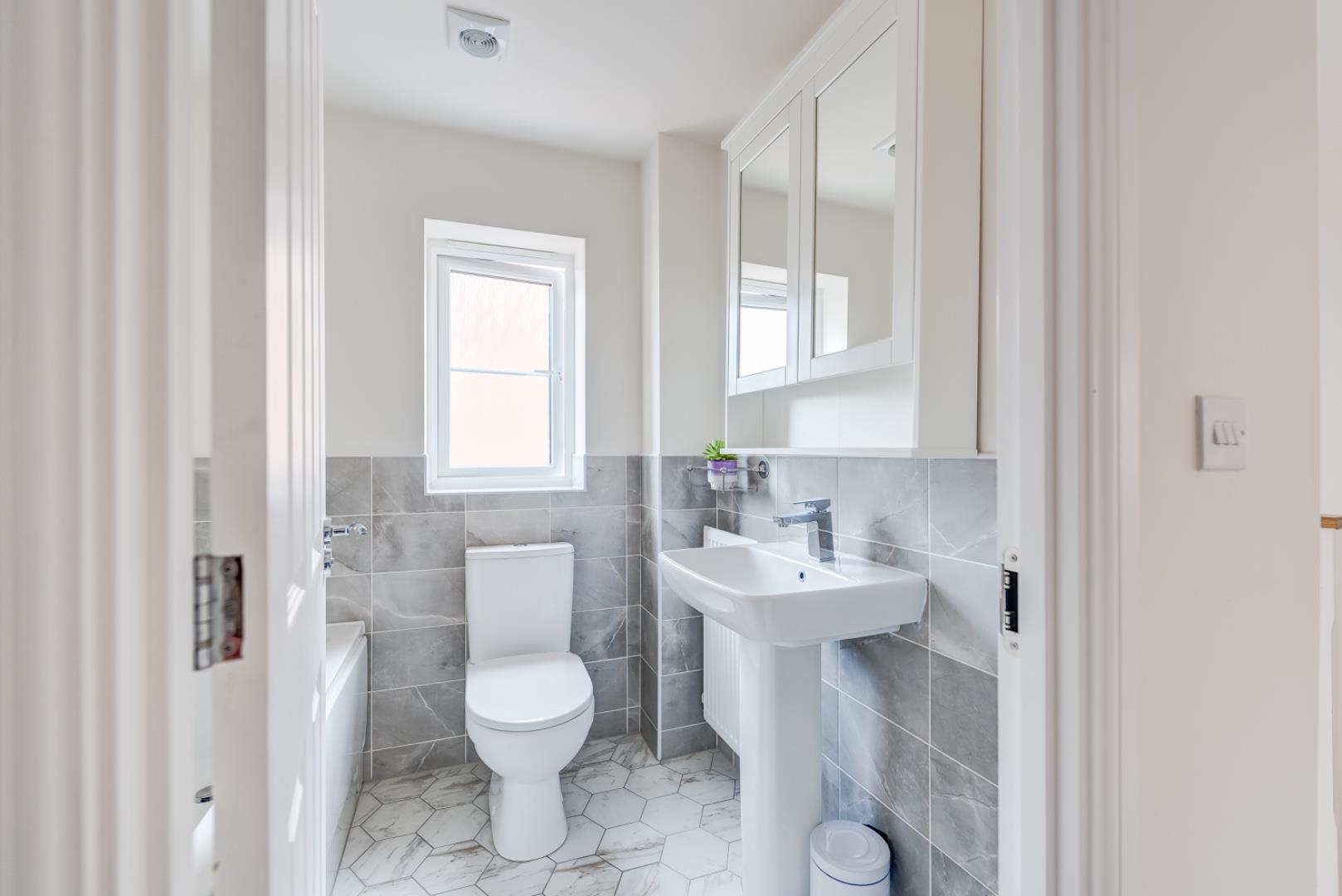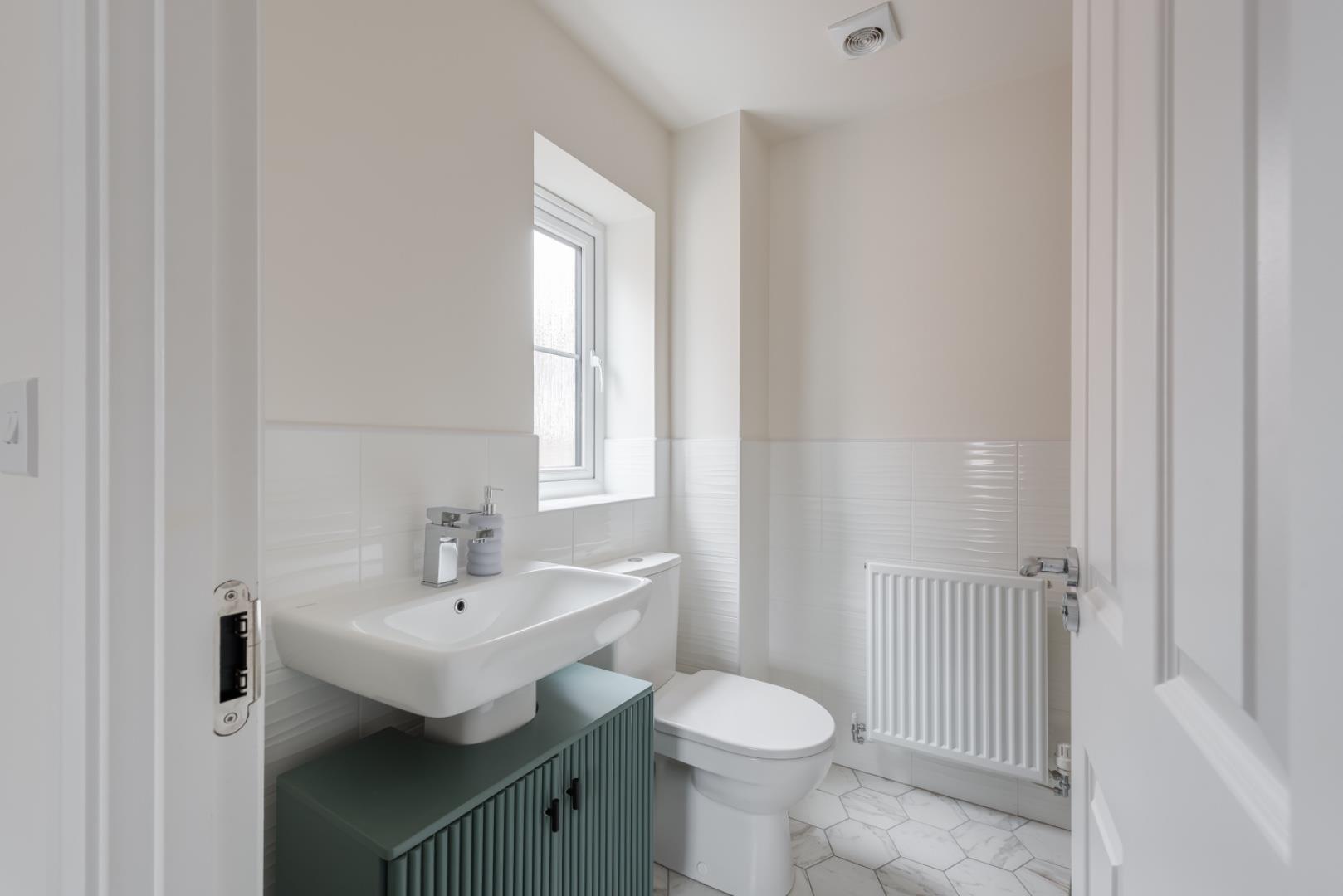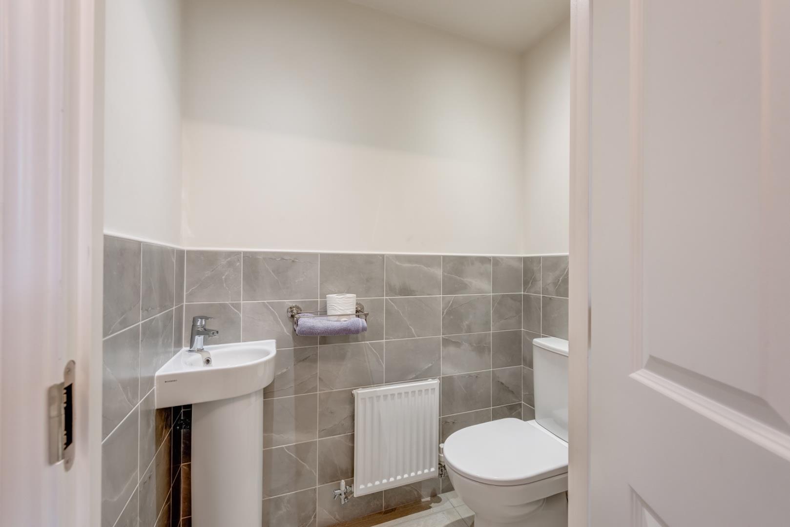 This ground floor cloakroom is thoughtfully designed with half-height tiled walls in a grey tone, paired with neutral paint above. It includes a compact basin and a close-coupled toilet, making it a convenient and practical addition to the home.