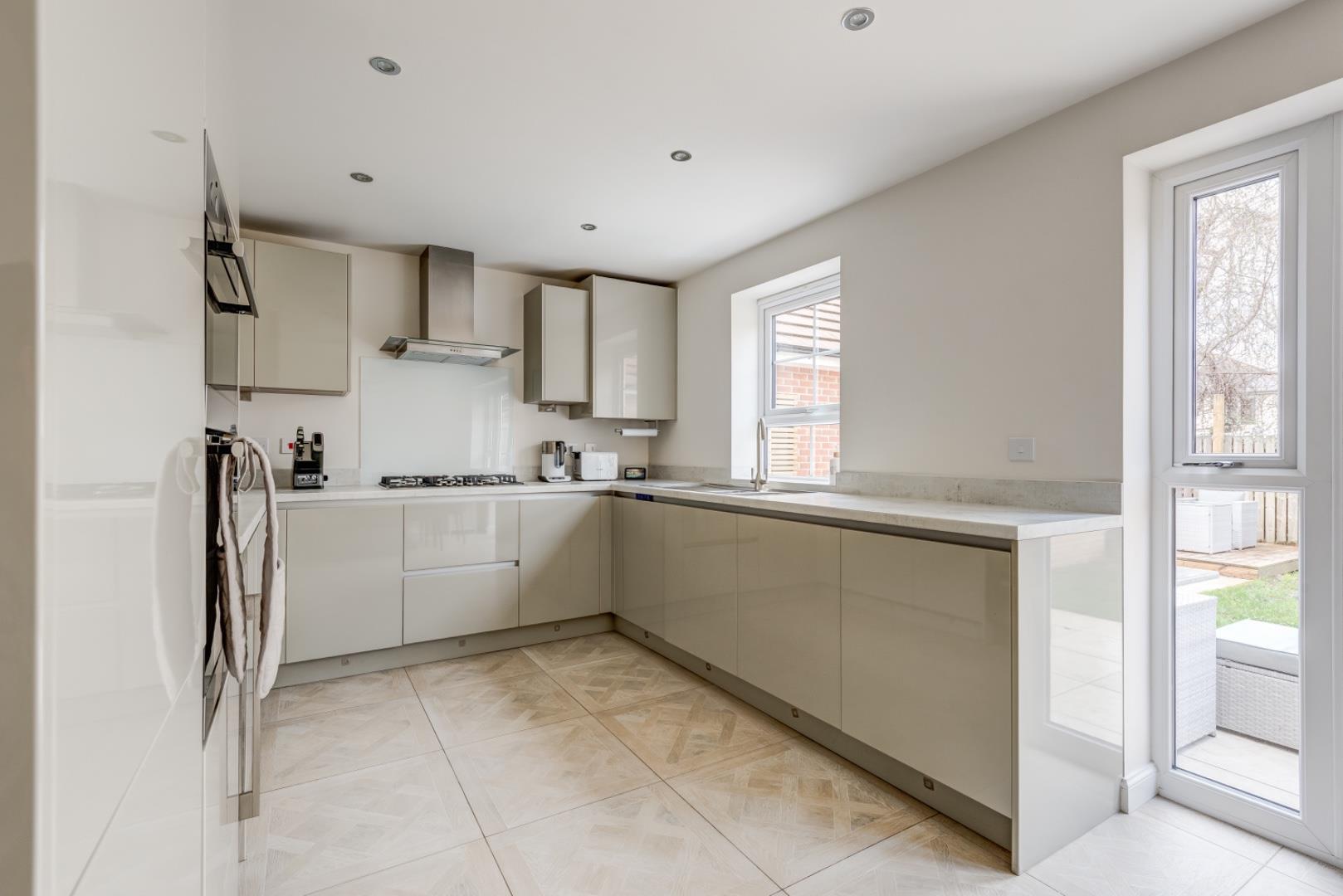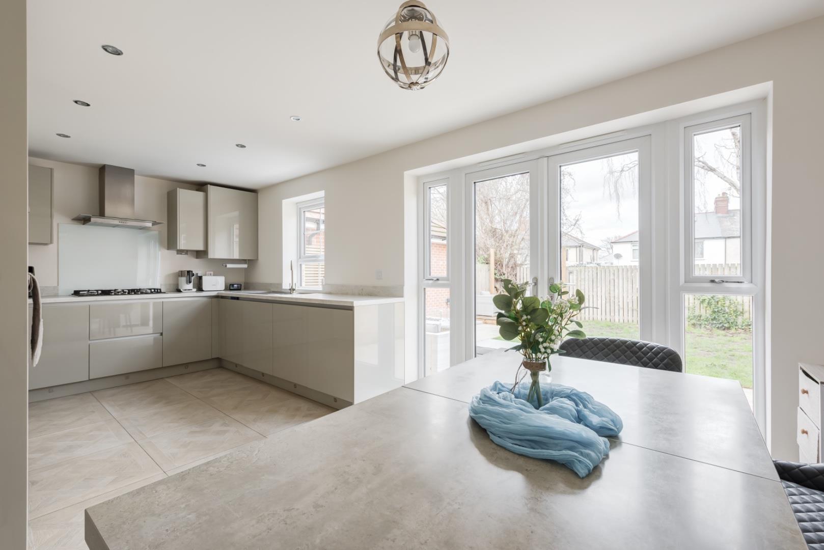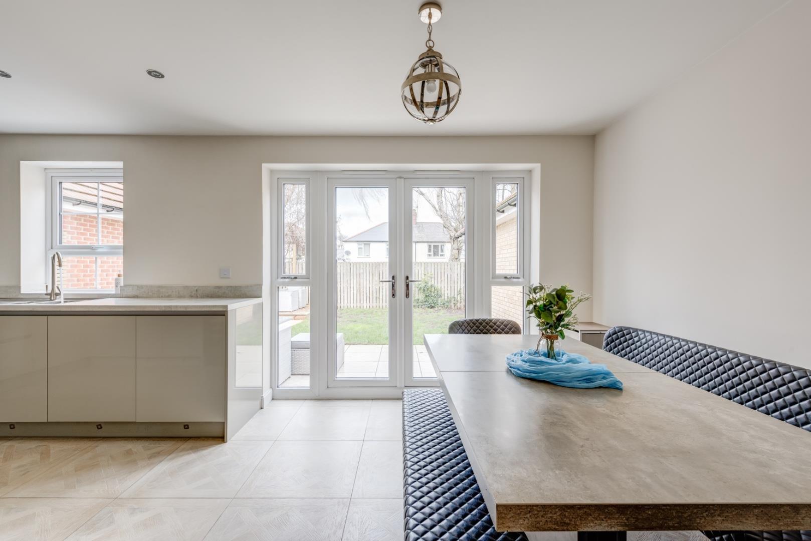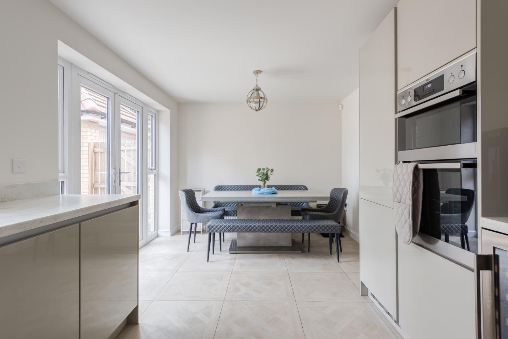The dining kitchen is a bright and spacious area fitted with modern, high-gloss cabinetry in a sleek light beige tone and complemented by stone-effect work surfaces. Integrated appliances include a double oven, gas hob with extractor, and a wine cooler, providing a contemporary and functional cooking space. The open dining area comfortably accommodates a table and bench seating, set beside French doors that lead out to the garden, flooding the room with natural light and offering easy outdoor access. The tiled flooring throughout adds to the clean, practical feel of this social hub. Adjacent is the handy utility room, equipped with plumbing for a washing machine and additional storage space.
