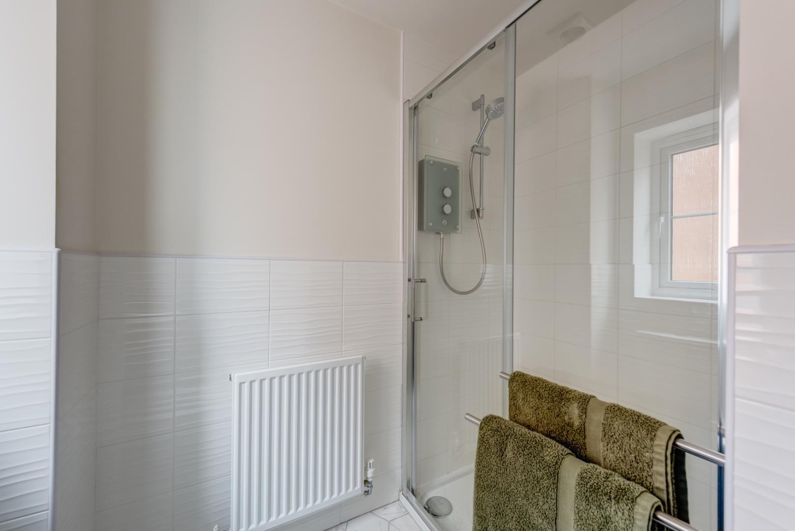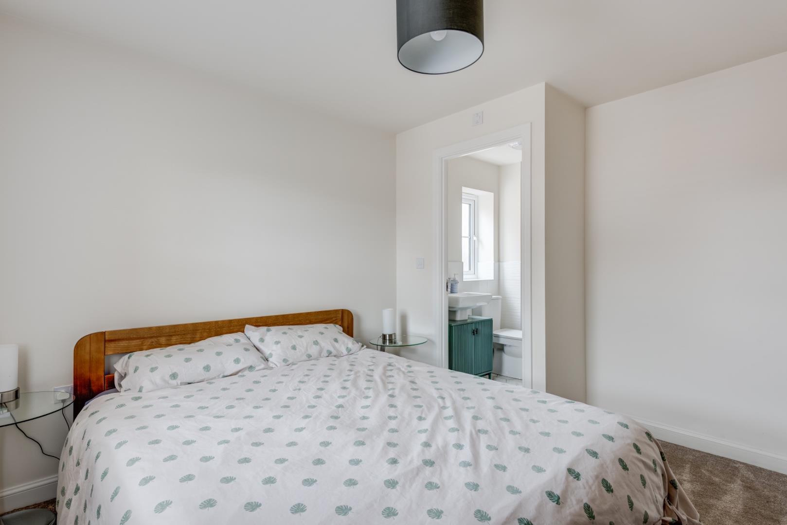 The master bedroom is a bright and calming retreat with soft carpeting and neutral walls. It comfortably fits a double bed and features an en-suite shower room, which is fully tiled in light hues and equipped with a walk-in shower, basin, and toilet. A window allows natural light to fill the room, enhancing its restful atmosphere.