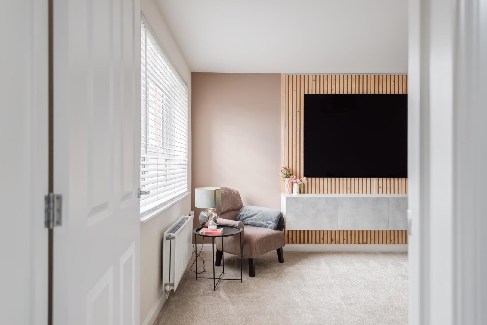 A peaceful lounge bathed in natural light from a front window, offering a serene space to relax. The soft carpet underfoot complements the neutral walls, while a modern media wall with vertical wooden slats and a floating cabinet creates a contemporary focal point for a TV.