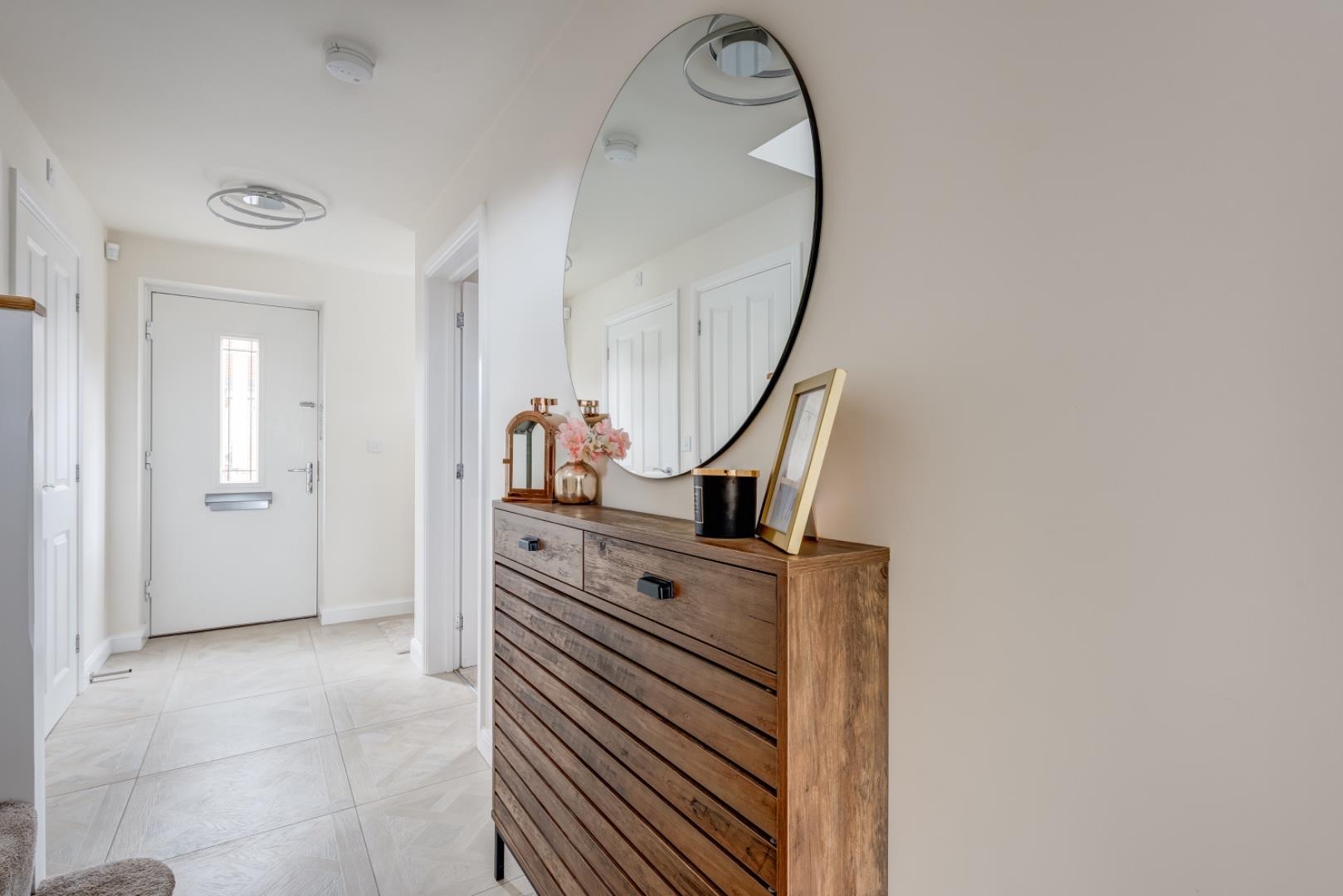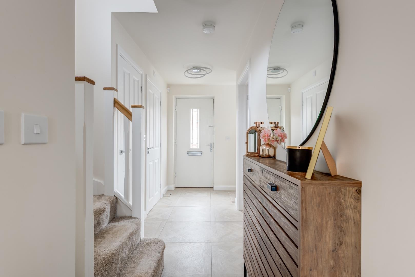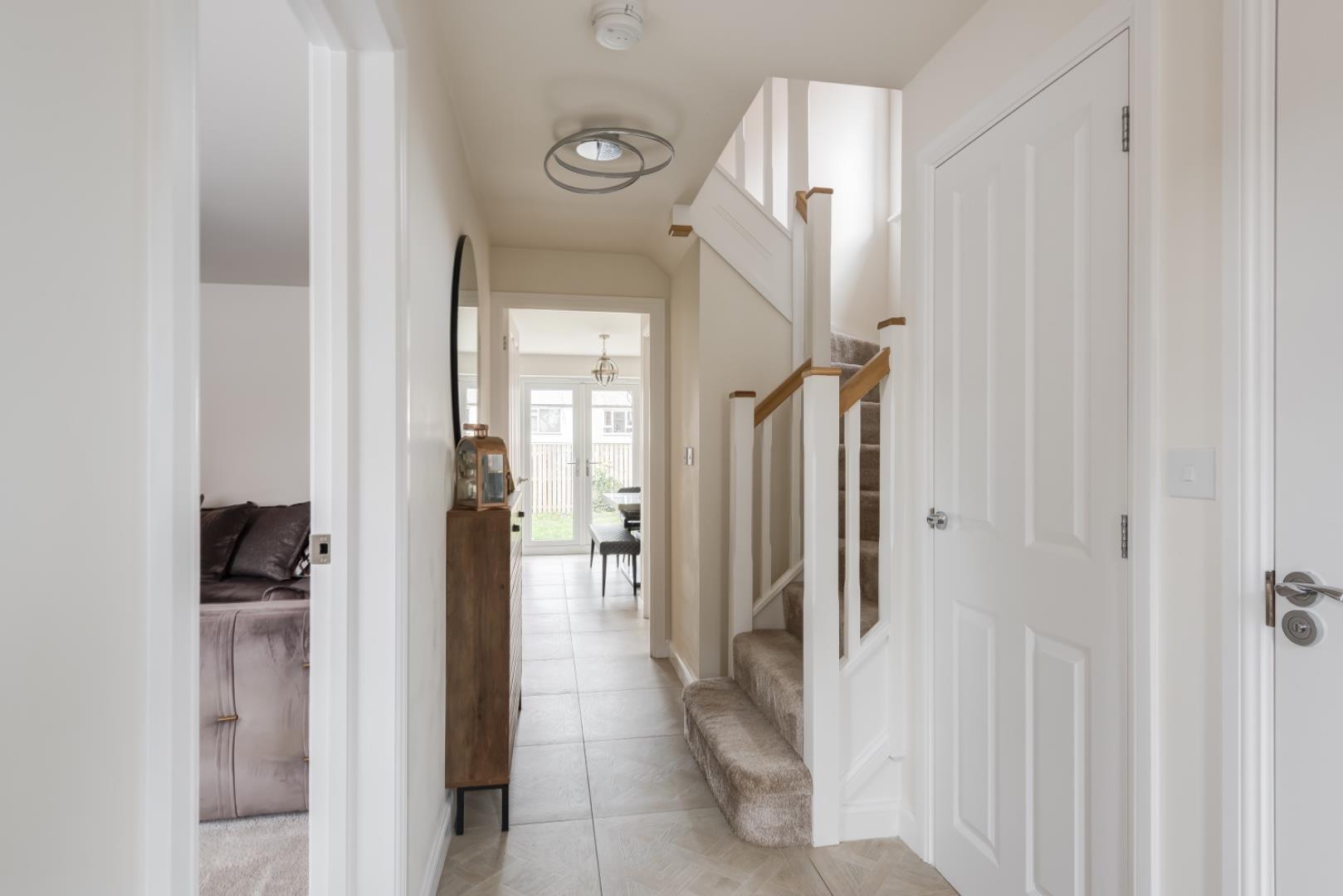 This inviting hallway welcomes you with its bright, neutral decor and tiled flooring, creating a clean and fresh ambiance. The staircase with carpeted steps leads gracefully to the upper floor. Doors off the hallway provide access to the cloakroom, utility room, and lounge, making it a well-connected entry space.