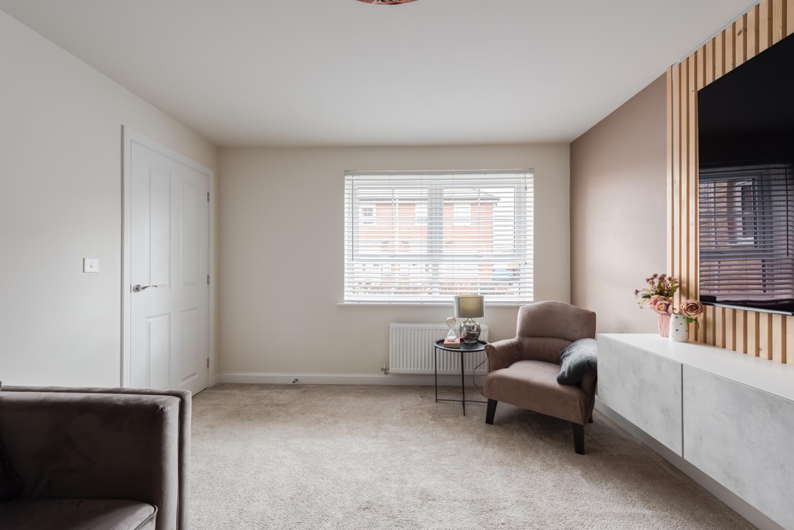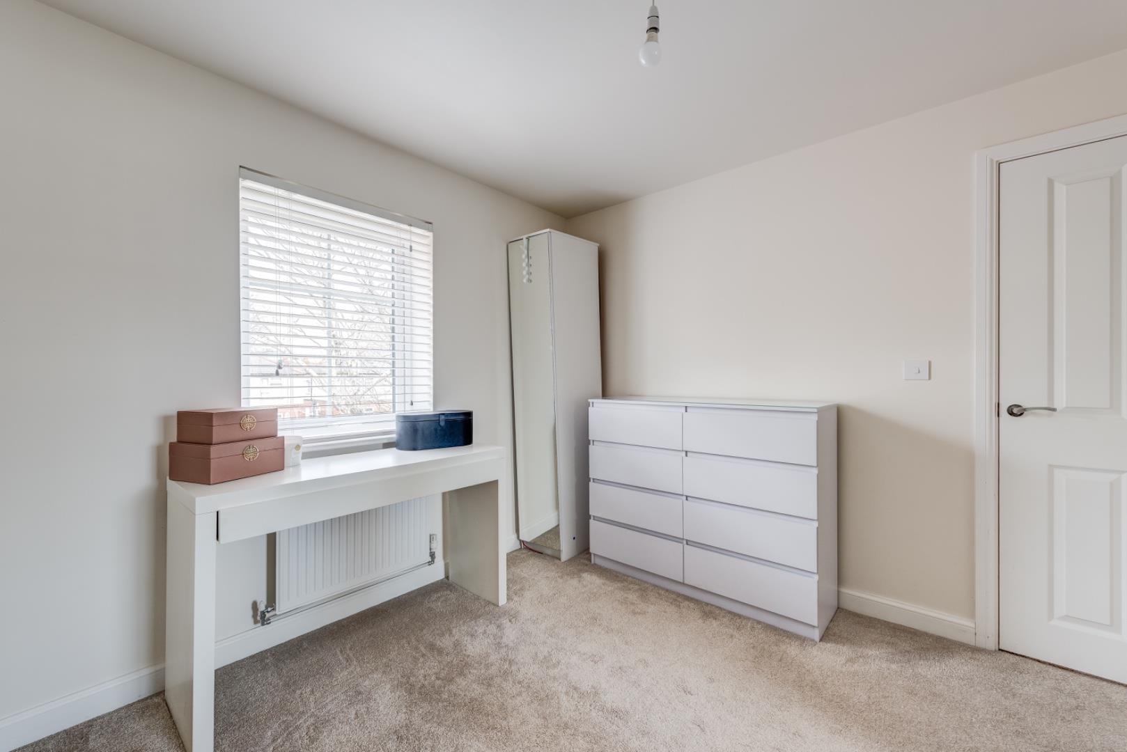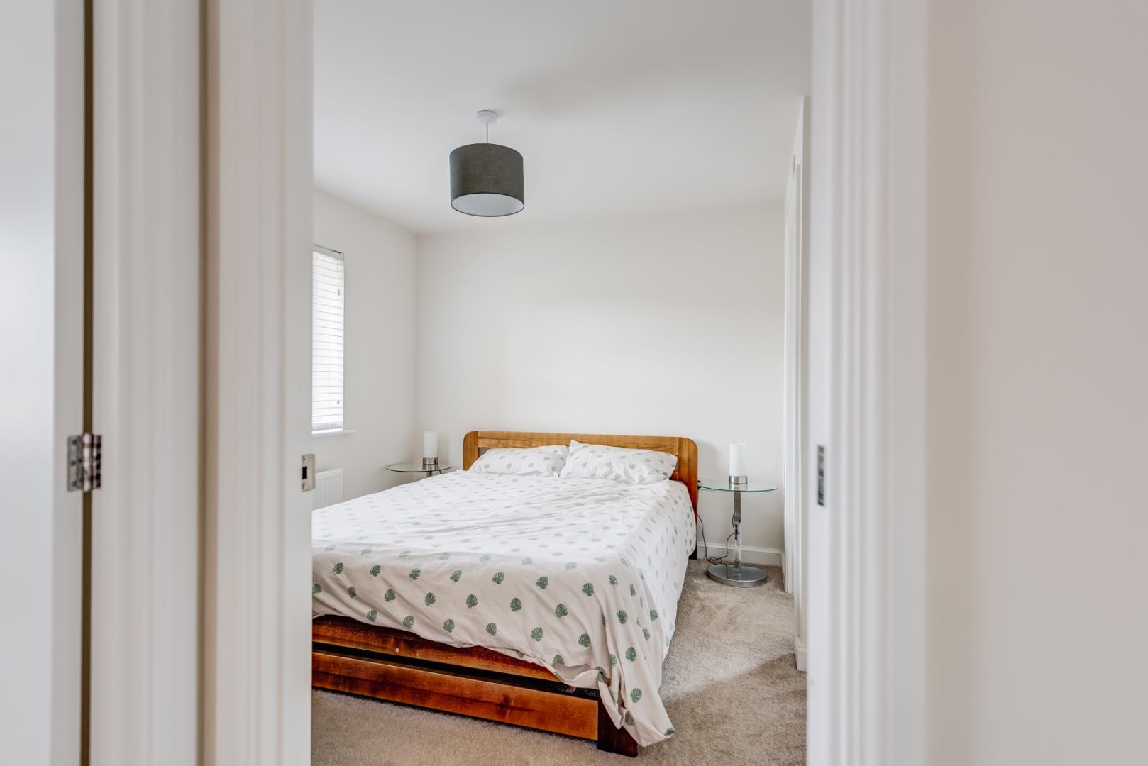 This second bedroom is a well-proportioned room with soft carpeting and neutral decor. It comfortably fits a double bed and benefits from natural light through a front-facing window, creating a cosy and inviting space.