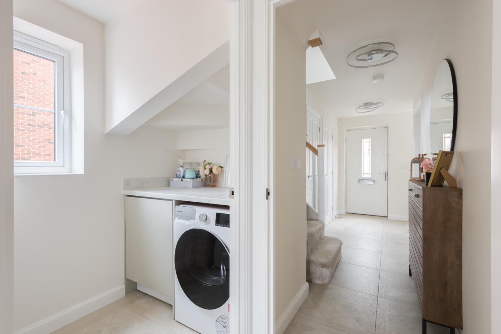 The utility room offers a practical space with tiled flooring and light walls, featuring plumbing and space for laundry appliances. A window allows natural light to brighten the room, which is conveniently positioned just off the kitchen for easy access.
