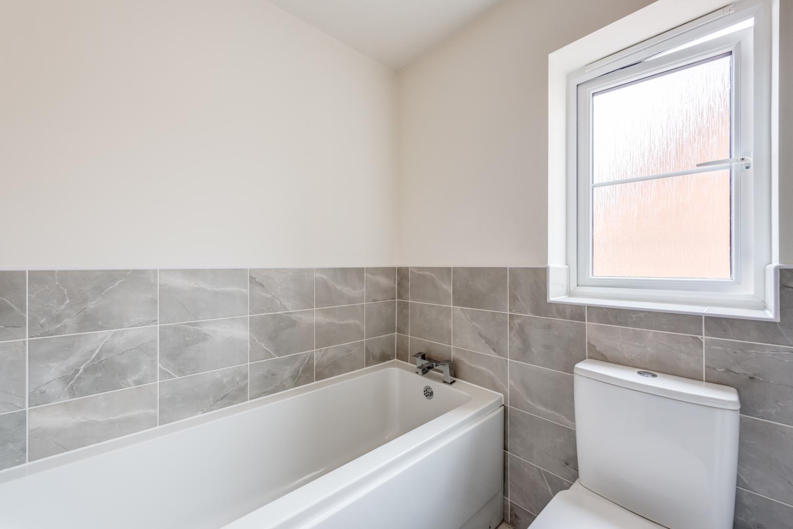 This well-appointed bathroom includes a modern white suite comprising a bath, basin, and toilet. Walls are tiled in a mid-grey tile with a light patterned floor tile, and a frosted window allows privacy and natural light.