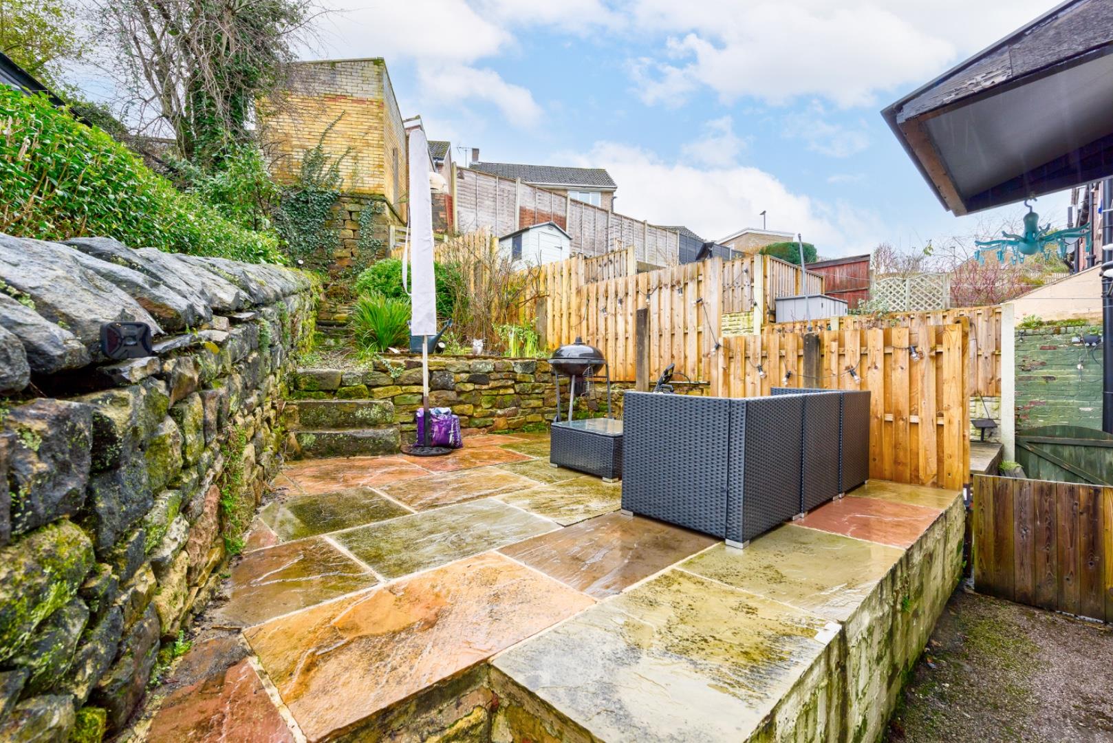 The rear garden is tiered, starting with a paved patio area ideal for outdoor seating and dining. Steps lead up to a higher level with planted borders and mature shrubs, enclosed by a wooden fence and stone walls, offering privacy and a pleasant natural feel. The garden benefits from lovely views over the surrounding area, providing a peaceful outdoor space to enjoy.