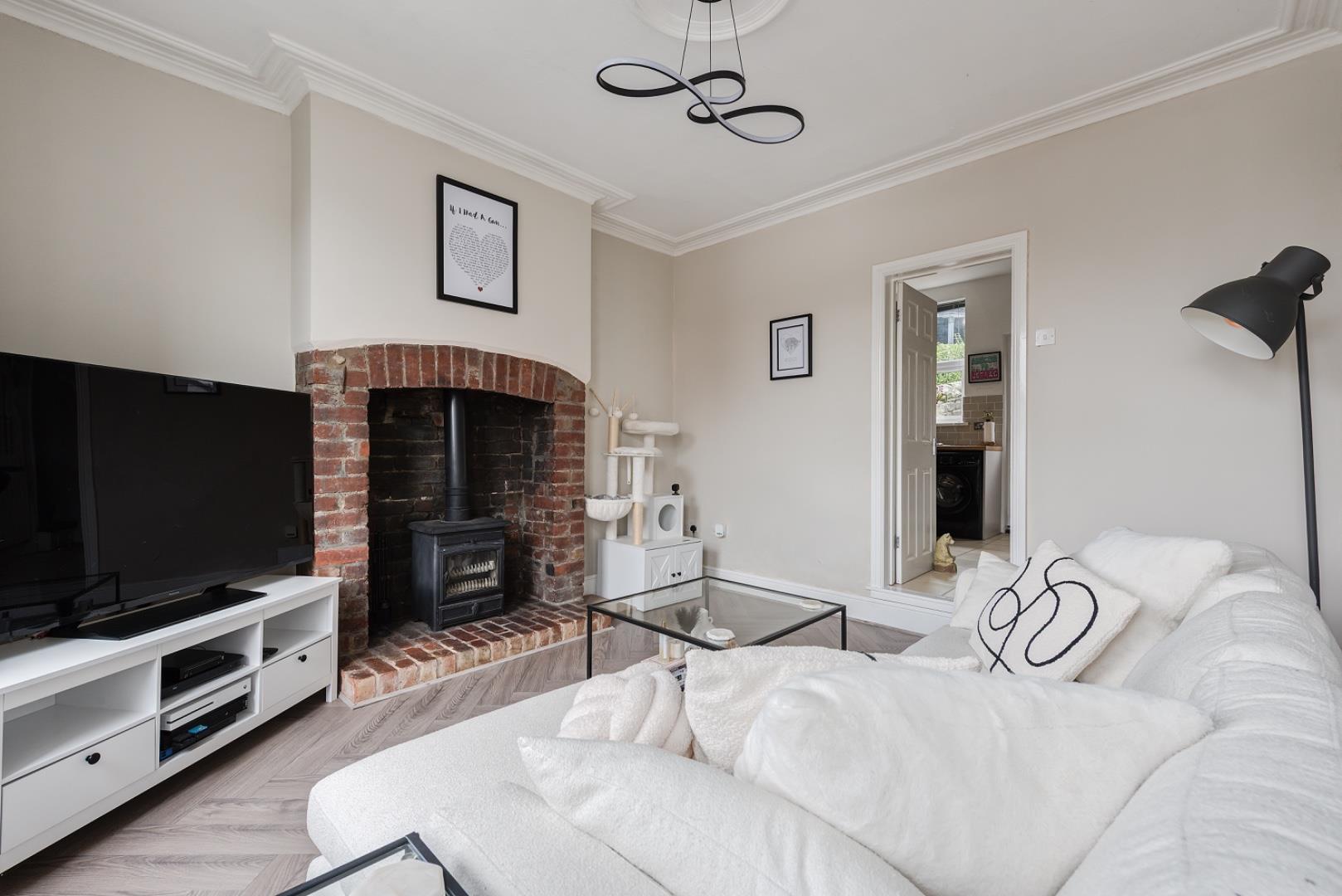 A welcoming living room featuring a charming exposed brick fireplace with a wood-burning stove, adding warmth and character. The space is bright and airy with a window and glass external door that allows plenty of natural light to fill the room. Neutral walls and light wood-effect flooring create a fresh and inviting atmosphere, perfect for relaxation. The room comfortably accommodates an L-shaped sofa and a TV unit, providing a cosy spot to unwind.