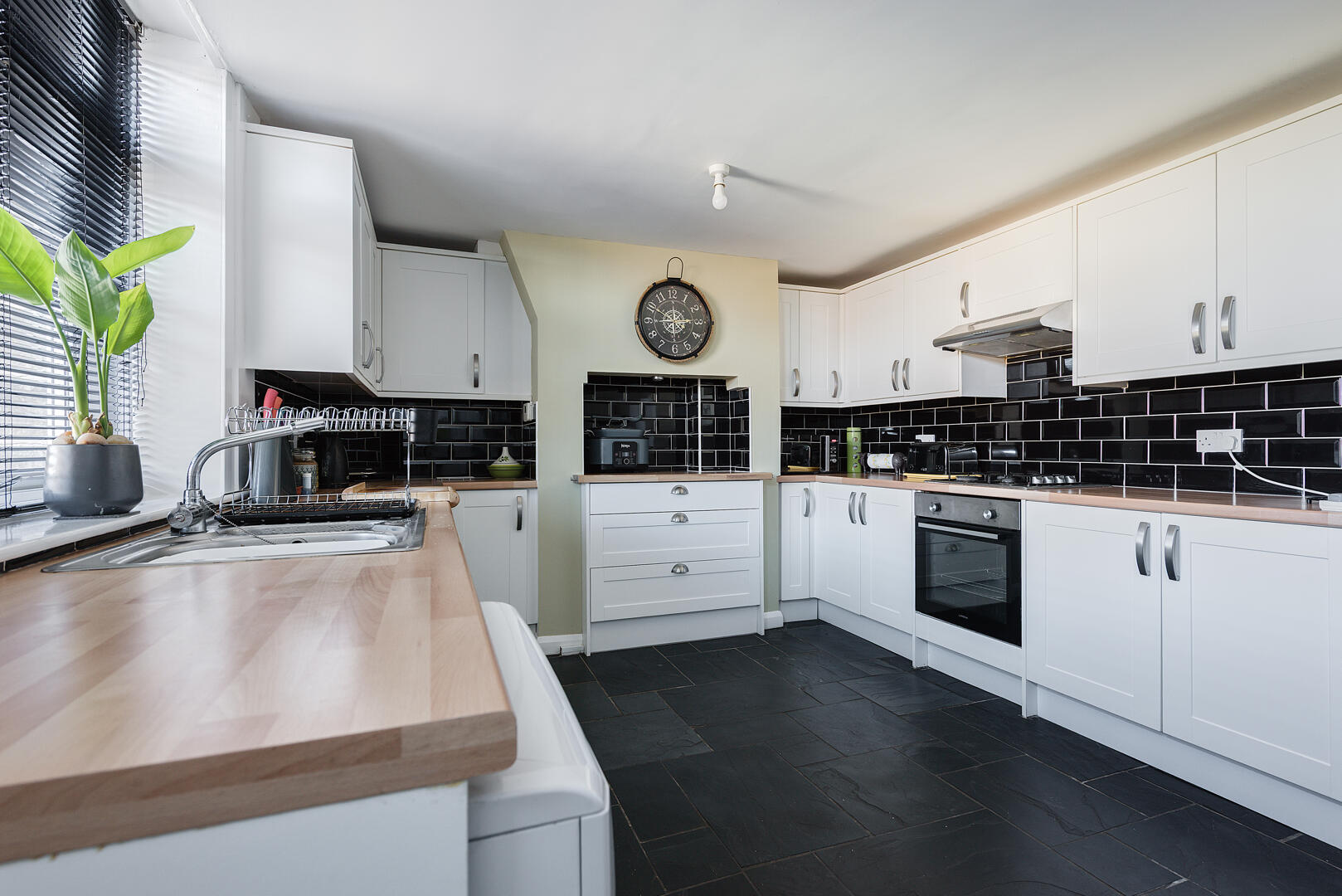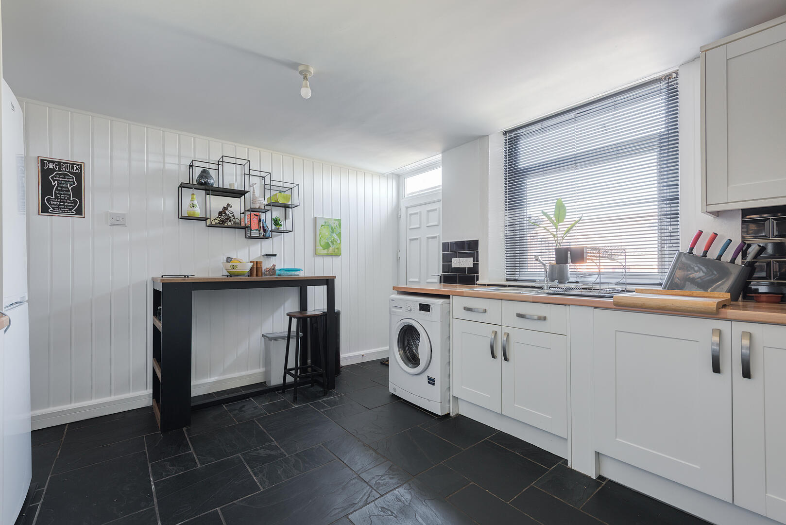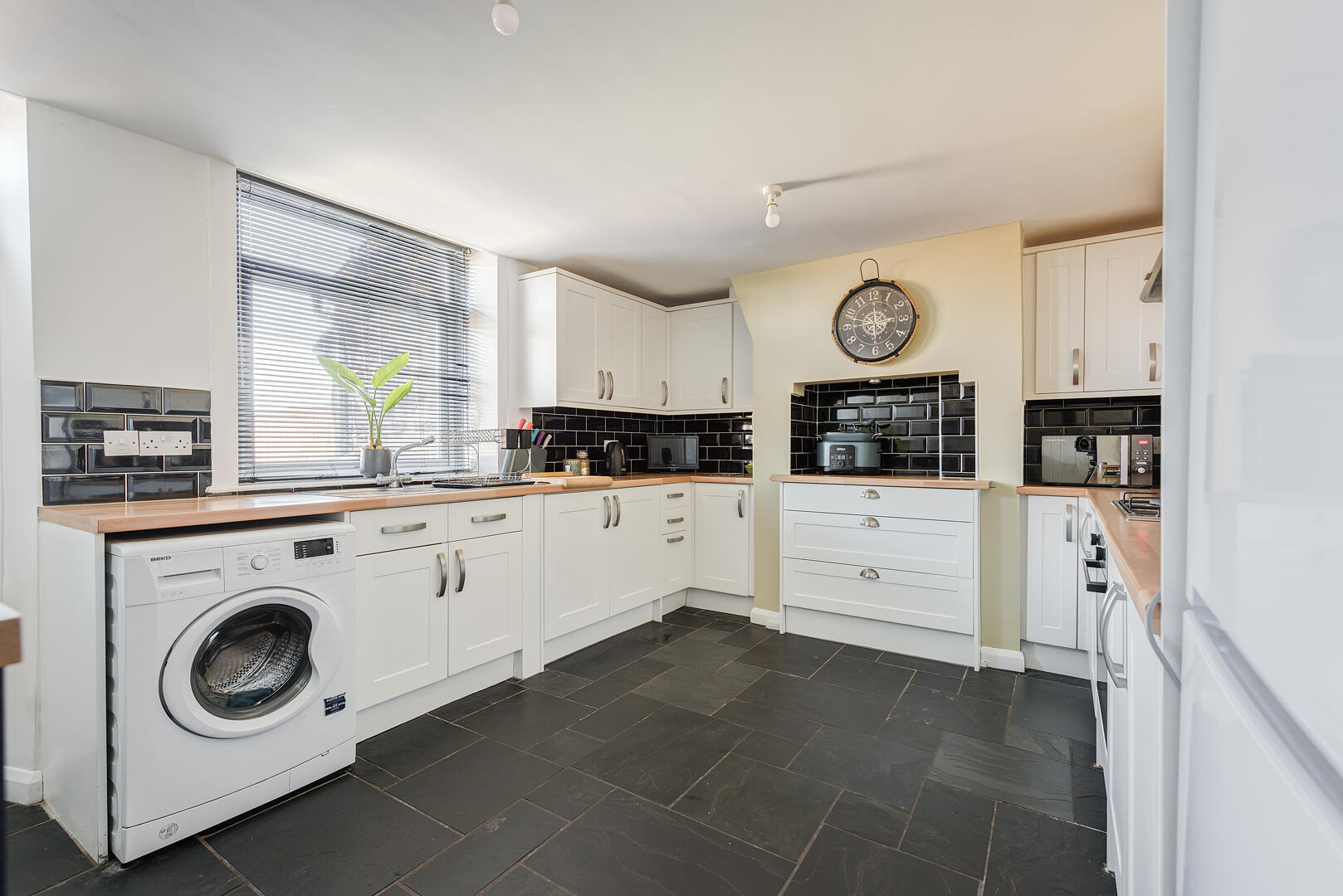 The kitchen is well-equipped and spacious, with white cabinetry and contrasting black tiled splashbacks that add a modern touch. Wooden work surfaces provide a warm finish, and integrated appliances are thoughtfully placed to maximise efficiency. Windows allow plenty of natural light, enhancing the sleek slate tiled floor and creating a bright, functional space for cooking and casual dining.