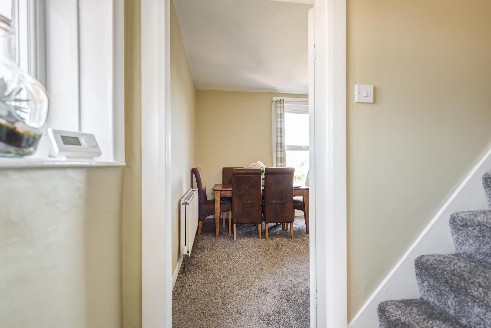 The hallway is bright and welcoming with soft, neutral walls and a carpet underfoot that extends throughout the home. It provides easy access to the dining room and the staircase leading upstairs. The space feels open and is accented by natural light streaming in from the front door’s window.