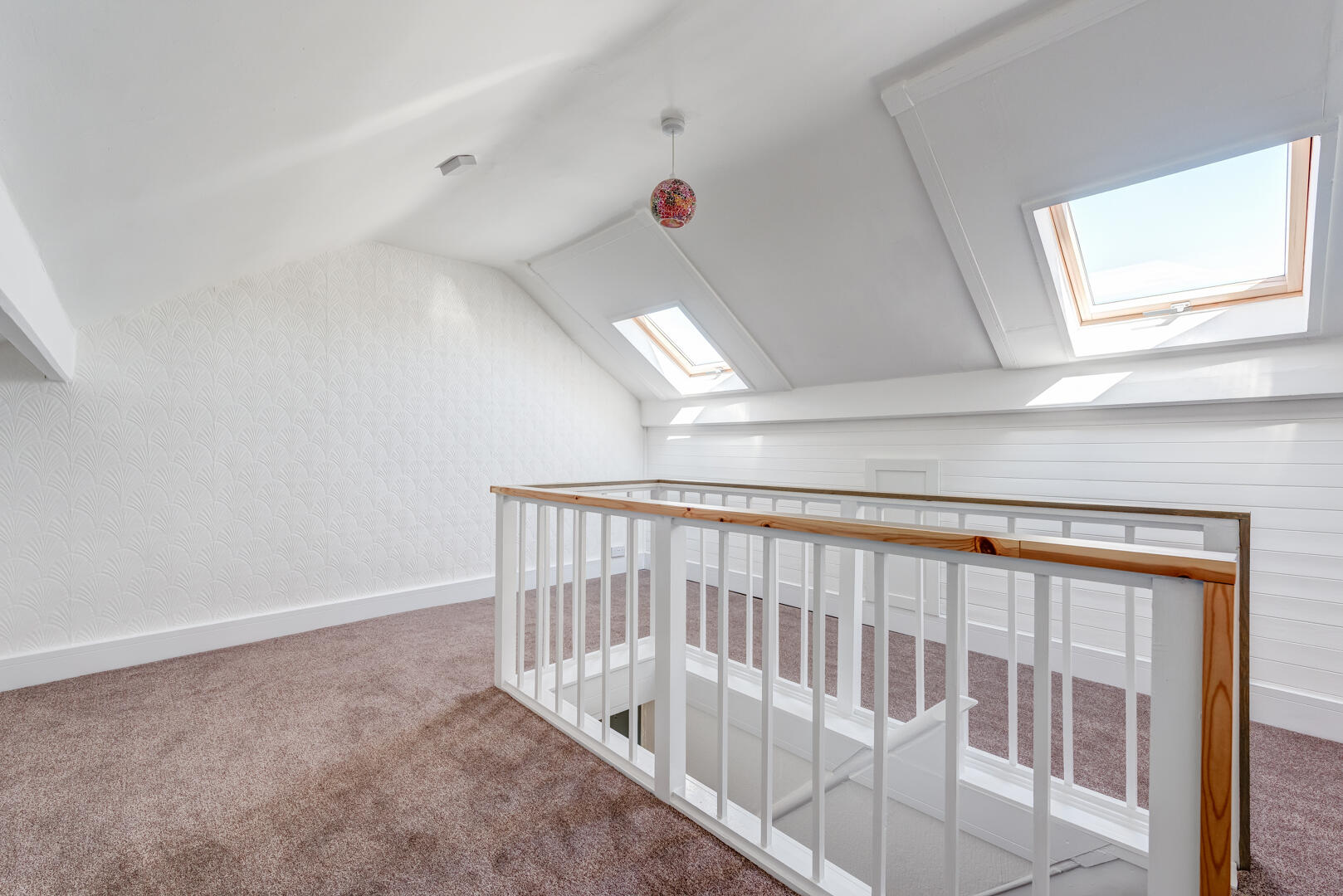 This second-floor landing is a bright, adaptable space with sloped ceilings and two skylights that flood the area with natural daylight. The white walls and neutral carpet make it a versatile area suitable for a variety of uses, such as a playroom, office, or additional living area.