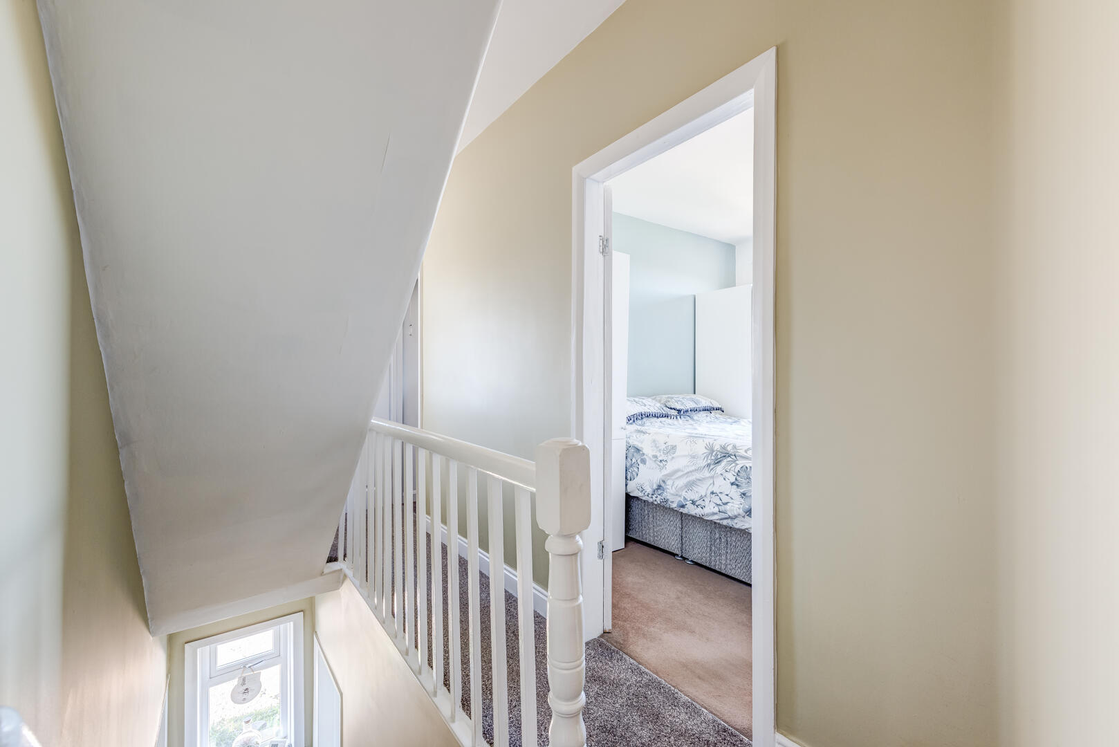 The landing is a light and airy transitional space at the top of the stairs. It features neutral walls and carpeting, with a window that allows natural daylight to brighten the area. The landing provides access to the bedrooms and bathroom on the first floor.