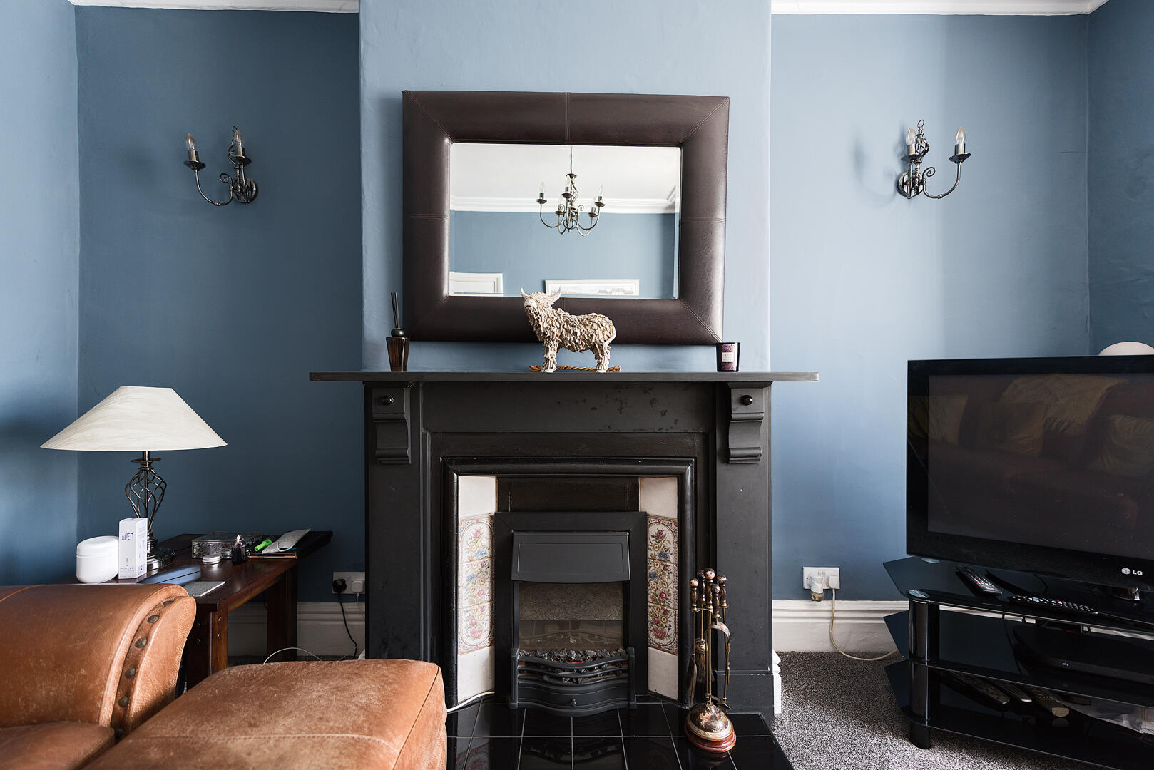 The lounge is a cosy, inviting space featuring a classic bay window that fills the room with natural light. The walls are painted in a deep, calming blue shade, creating a warm atmosphere complemented by the dark wood fireplace at its centre. The space comfortably accommodates a set of leather sofas, perfect for relaxing or entertaining.