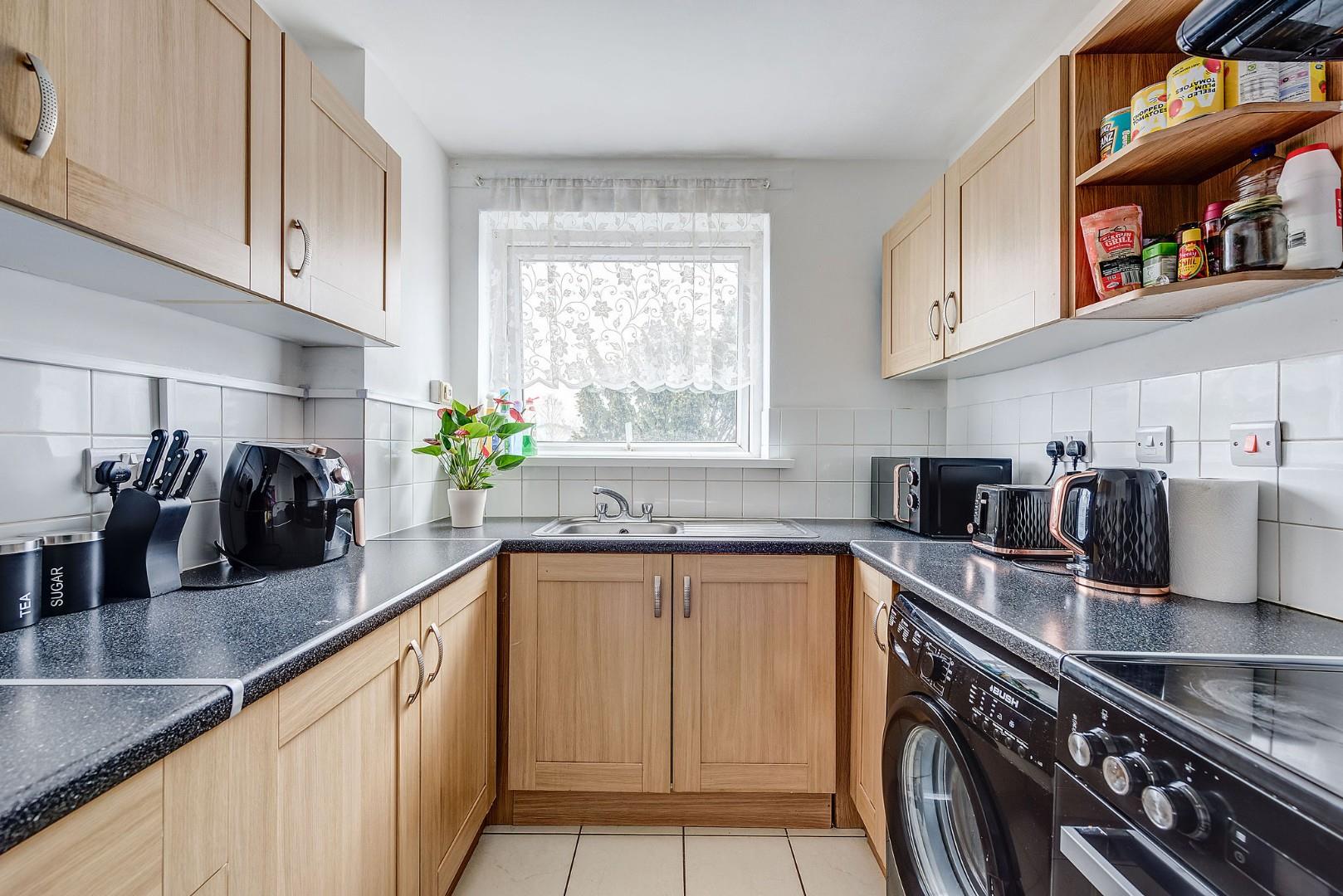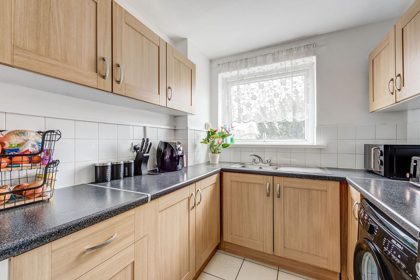 Wall and base units with space for washing machine, fridge freezer, oven, sink with drainer. Rear facing window.