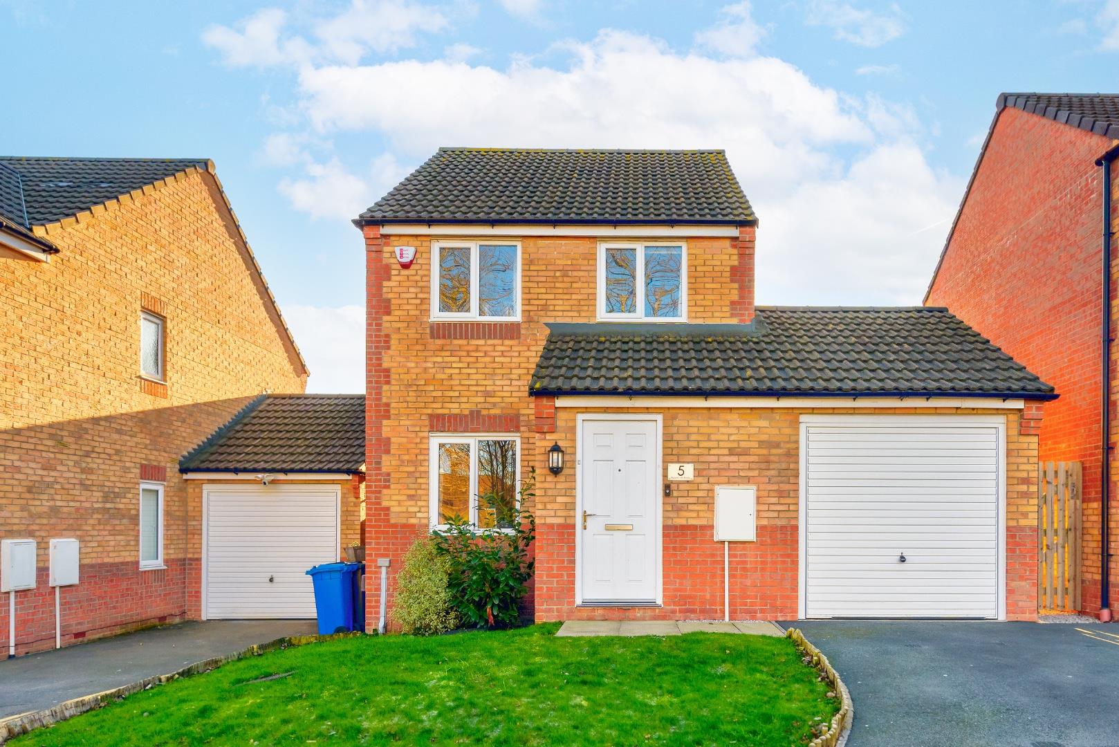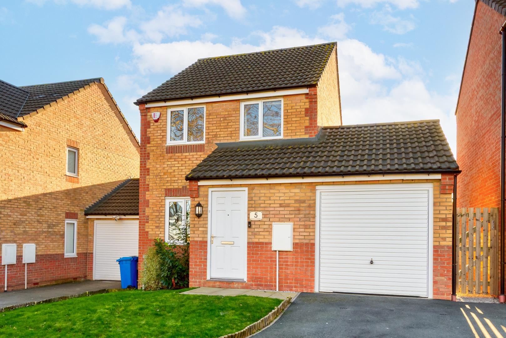 The driveway leads to a single garage with an up-and-over door, providing secure parking and additional storage. The front garden is lawned with a curved path leading to the front door, framed by neat brickwork and exterior lighting.