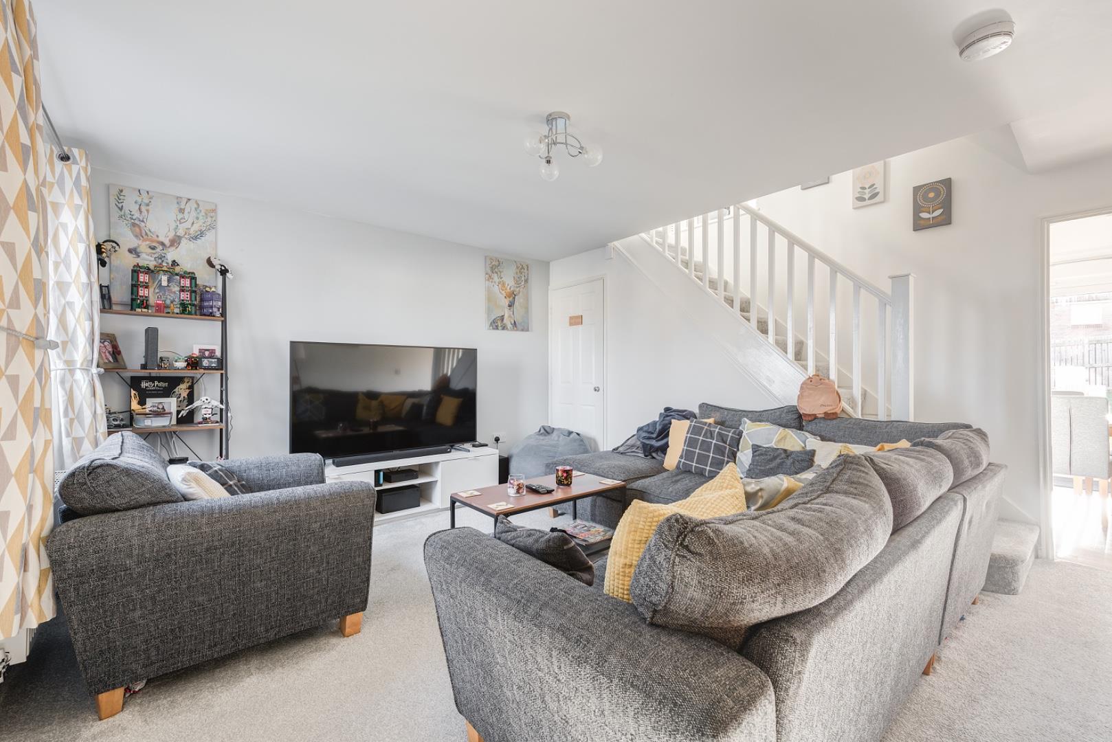 A spacious lounge filled with natural light from a front-facing window. Stairs rise from one side of the room, adding a sense of openness.