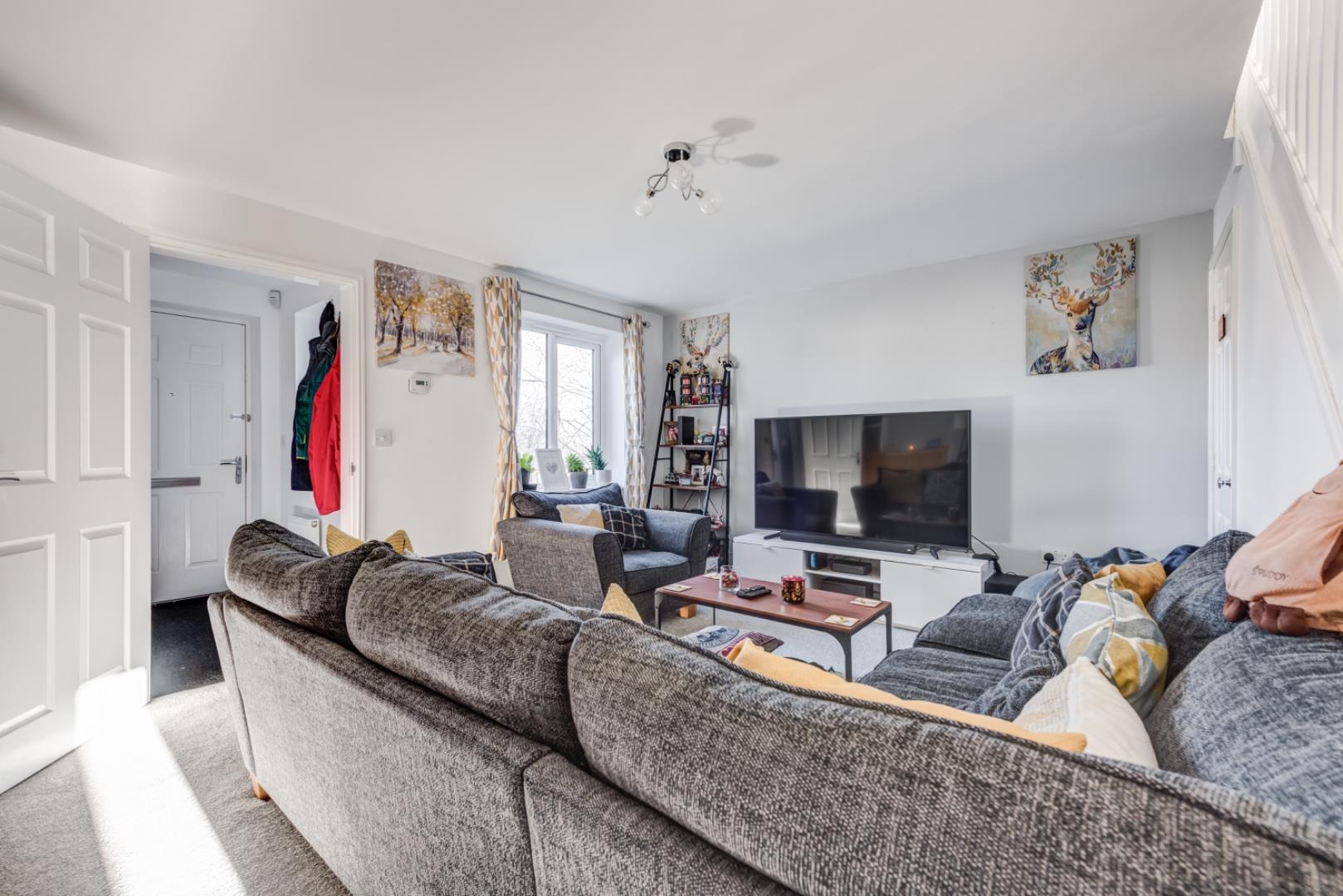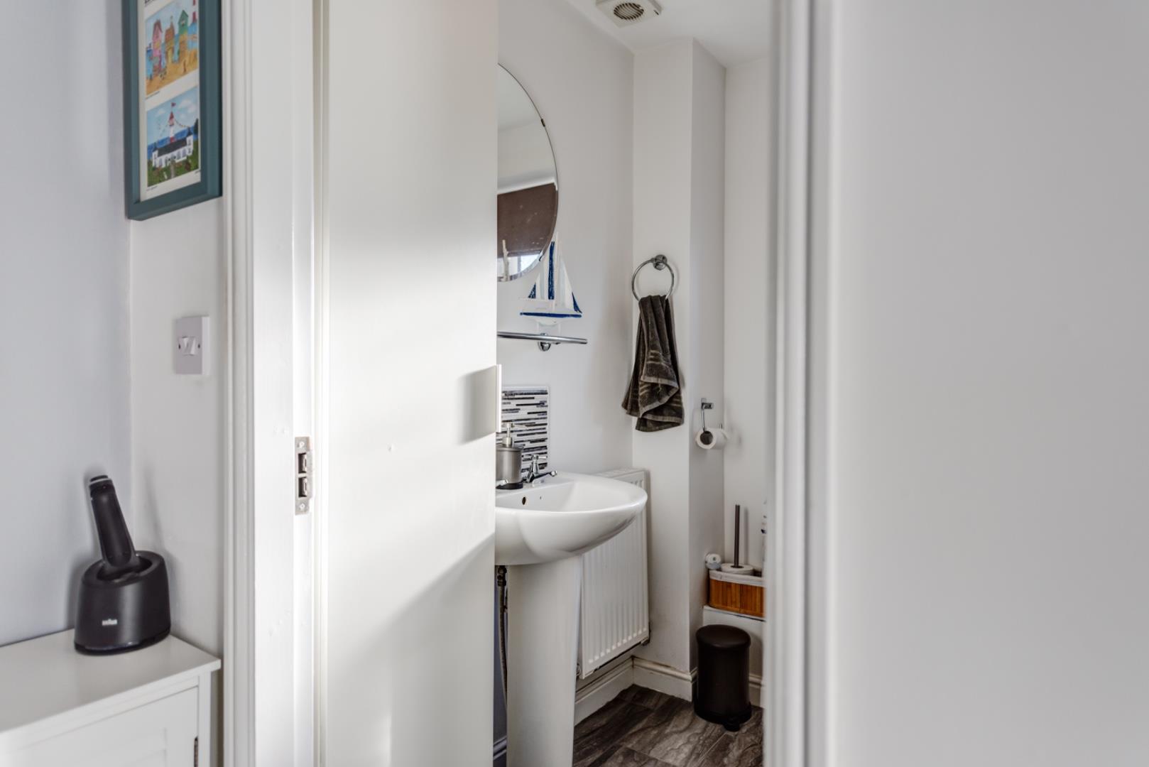 The entrance hall is neat and practical with a white front door and radiator. It leads directly to the lounge and has a door to a convenient downstairs WC fitted with a modern white suite and a small basin, decorated with warm tones.