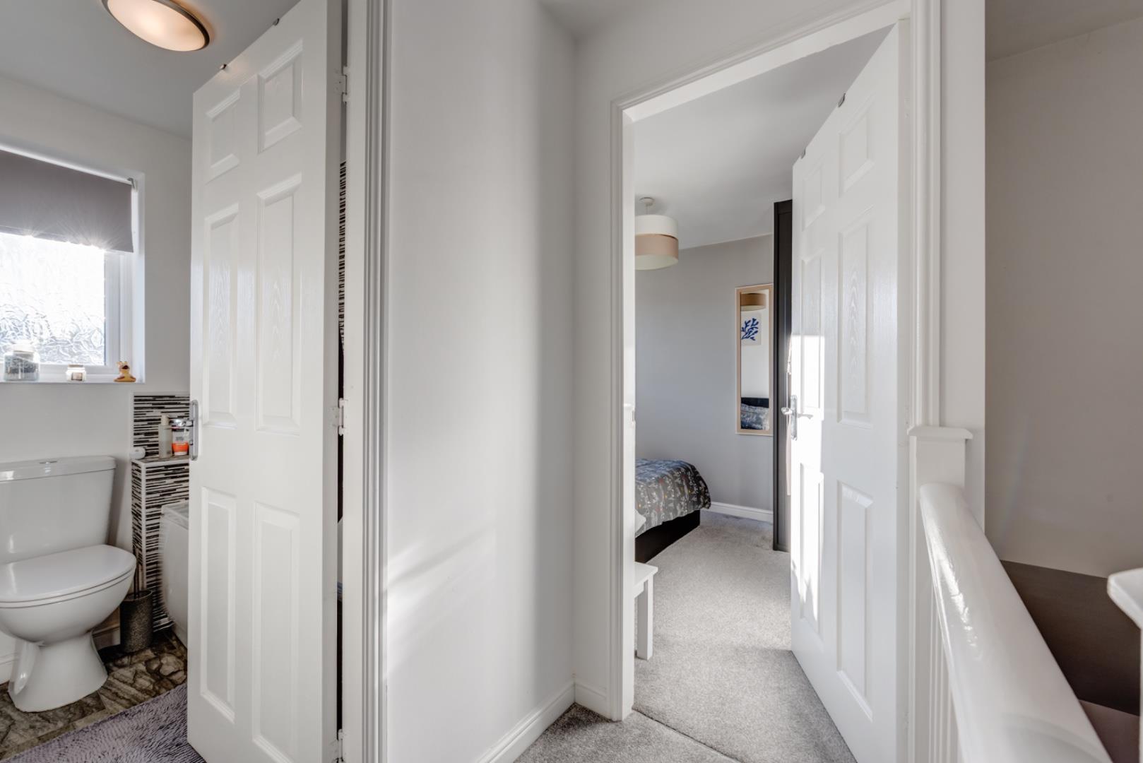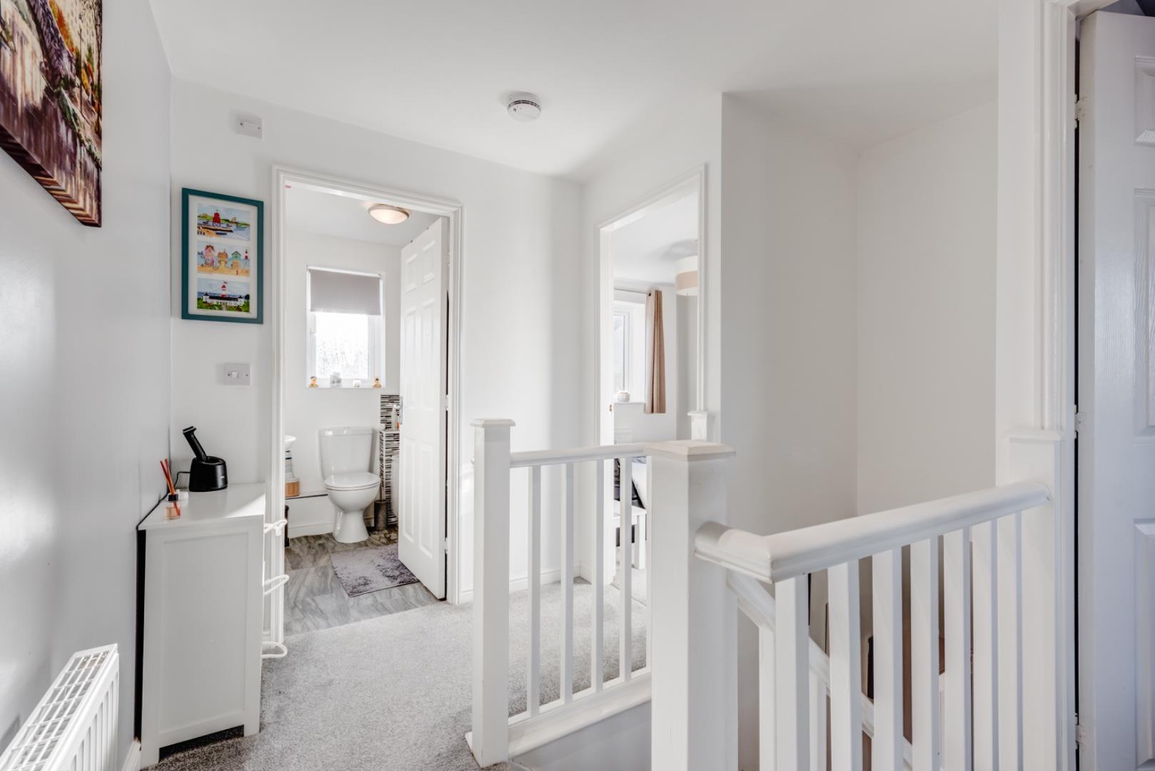 The first-floor landing is bright and welcoming with neutral décor and carpeting, leading to all bedrooms and the family bathroom. It has a light and airy feel with white balustrades and walls decorated with artwork.