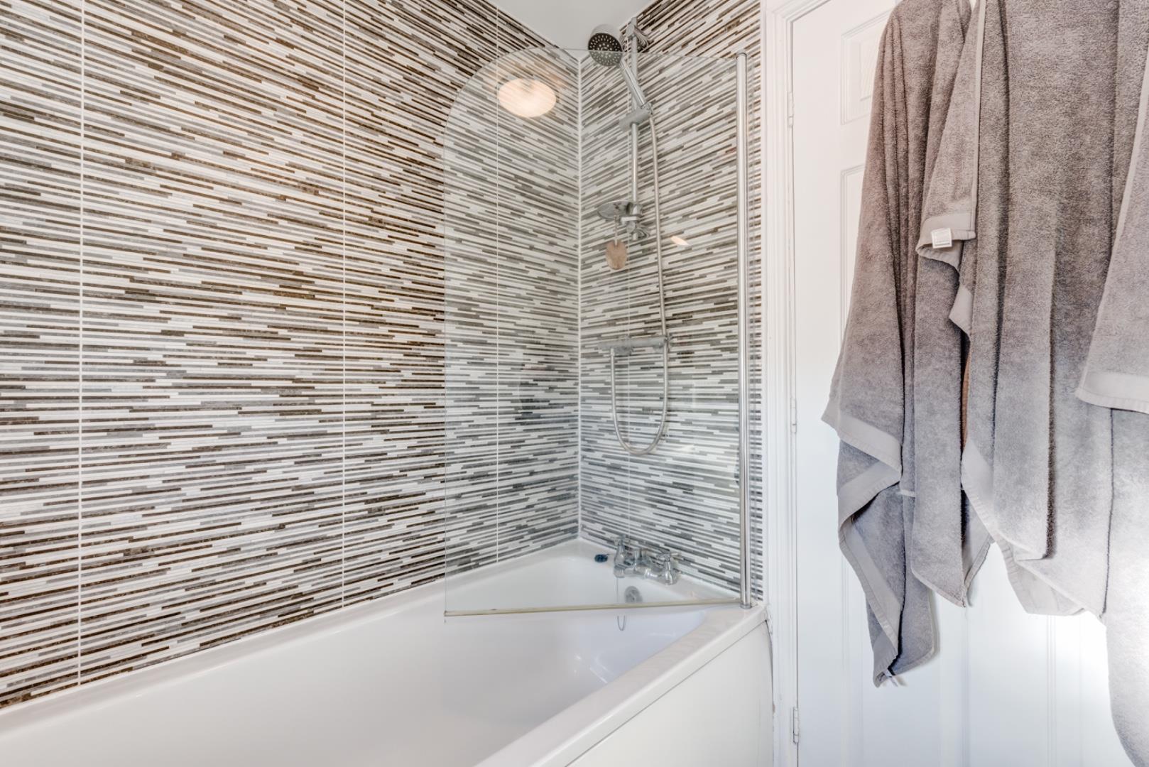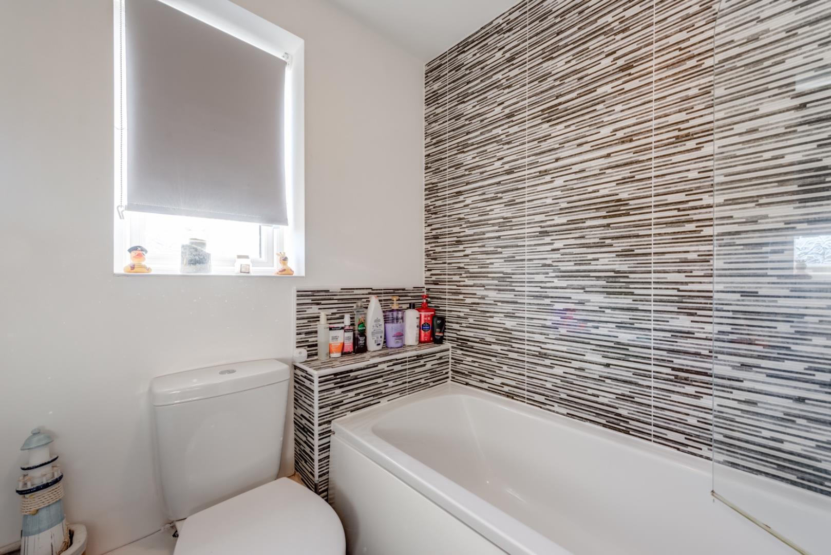 The family bathroom features a bath with an overhead shower and glass screen, modern fittings, and a tiled splashback with a striped pattern. A frosted window ensures privacy while allowing natural light. The flooring has a wood-effect finish, complementing the neutral palette.