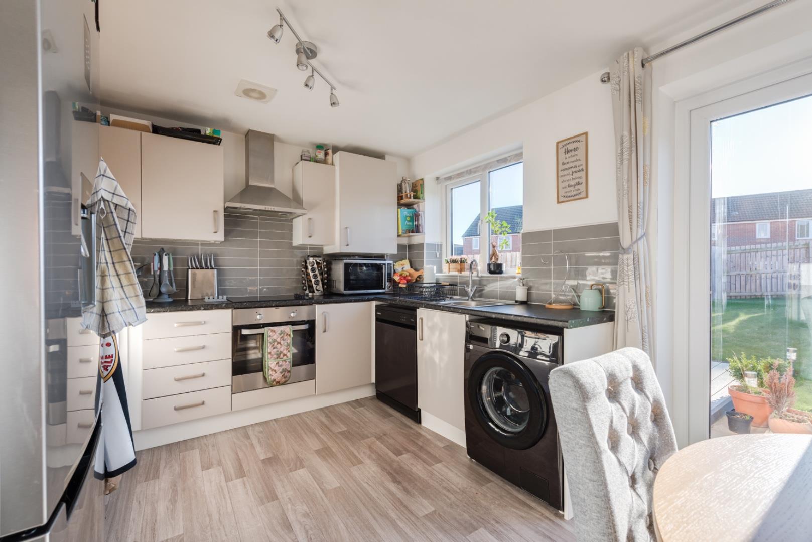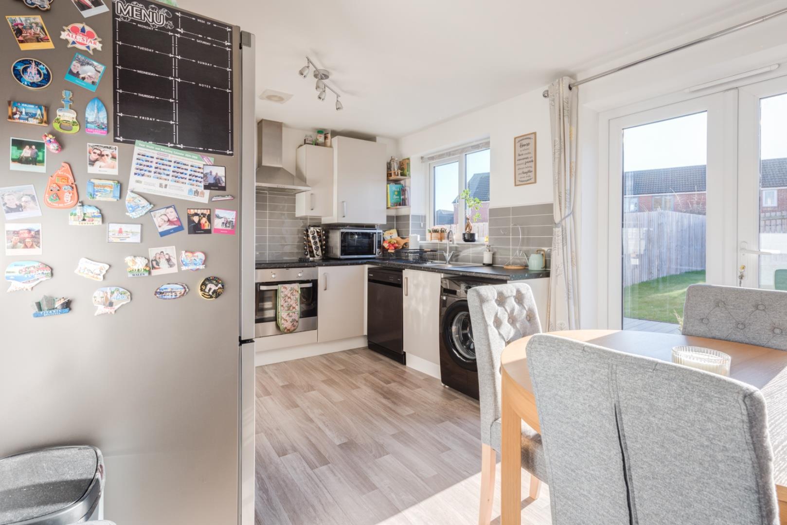 The dining kitchen is bright and modern with ample natural light from windows and a glass door leading to the rear garden. It is fitted with a range of white cabinets and black countertops, complemented by neutral tiled splashbacks. Appliances include an oven, hob and space for a washing machine and fridge freezer. A wooden dining table with upholstered chairs provides a comfortable space for meals, with the garden easily accessible through the double doors.