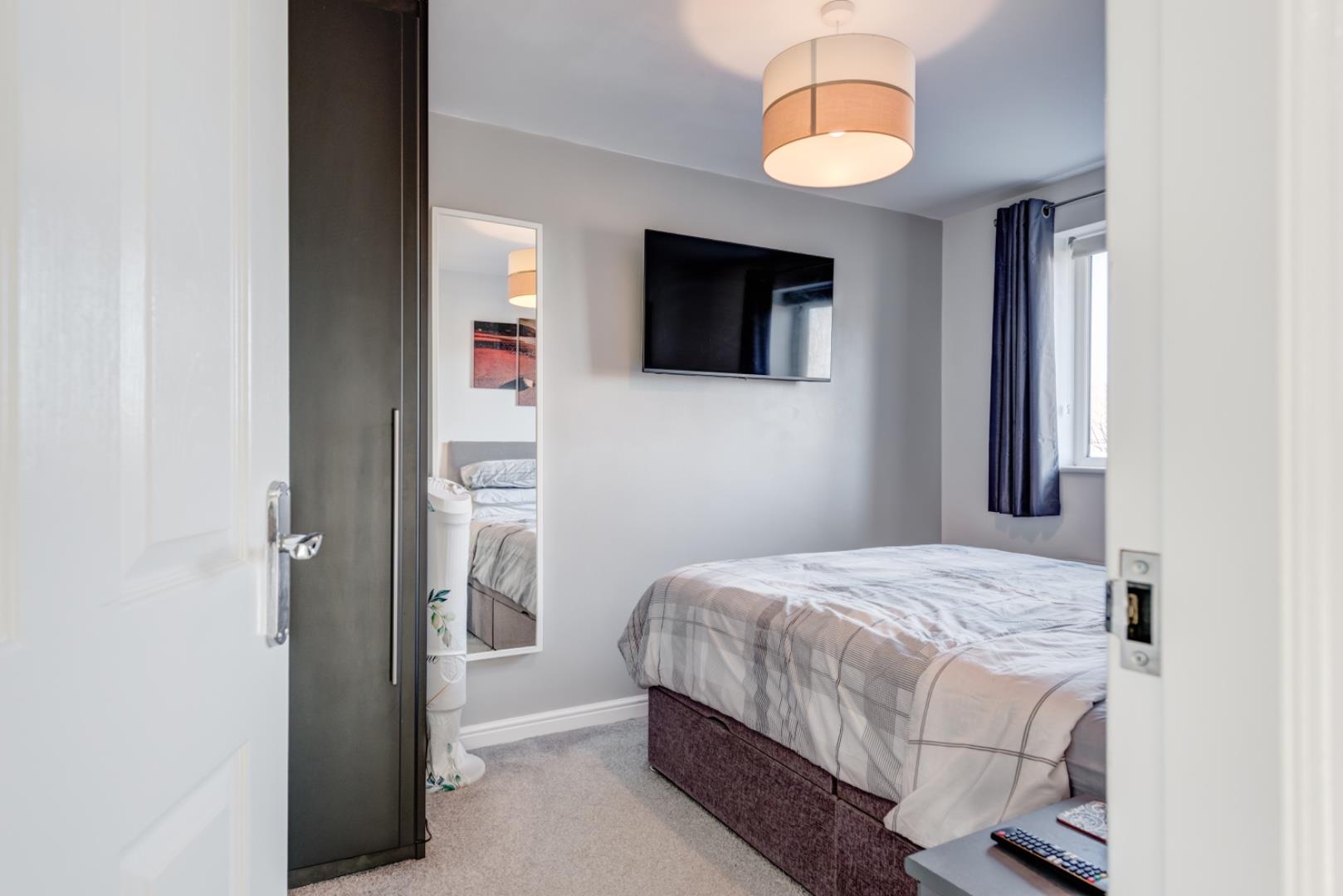 Bedroom 2 is a comfortable double room, with a window letting in plenty of daylight. The room maintains a calm atmosphere with neutral walls and carpeting and offers space for bedroom furniture and storage. Also has fitted wardrobes.