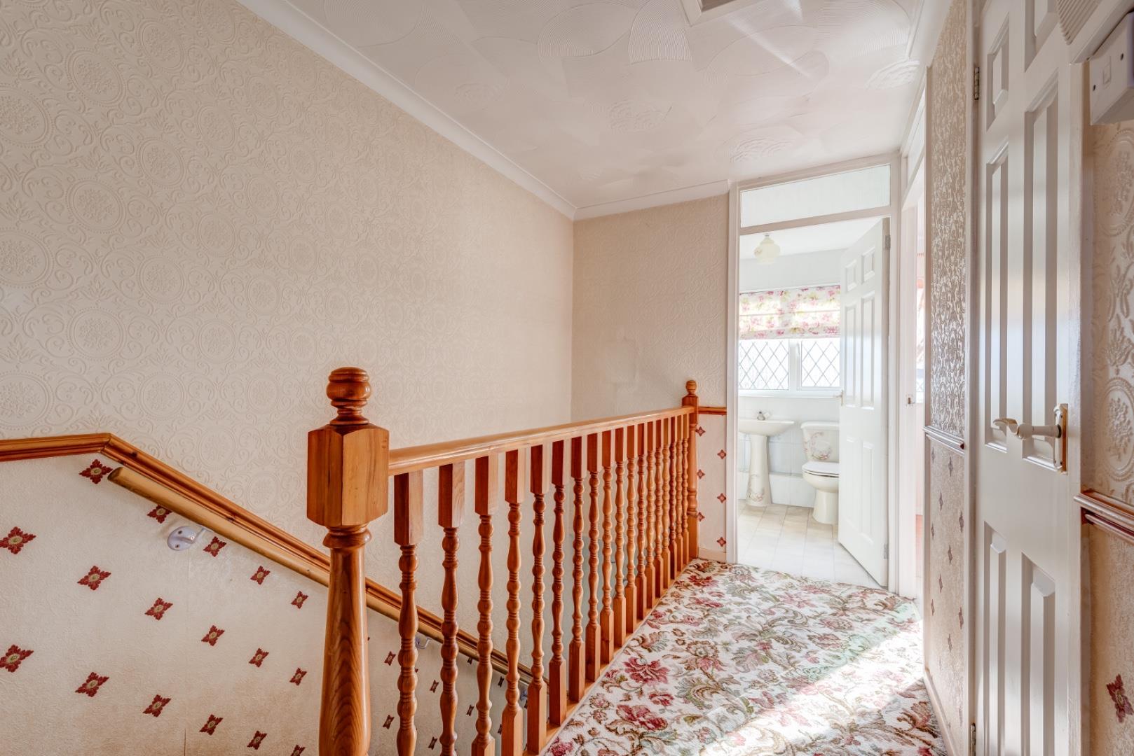 The area features fitted carpeting and wooden balustrades matching the hallway. It serves as a practical central point connecting all first floor rooms, with a small storage cupboard for added convenience.