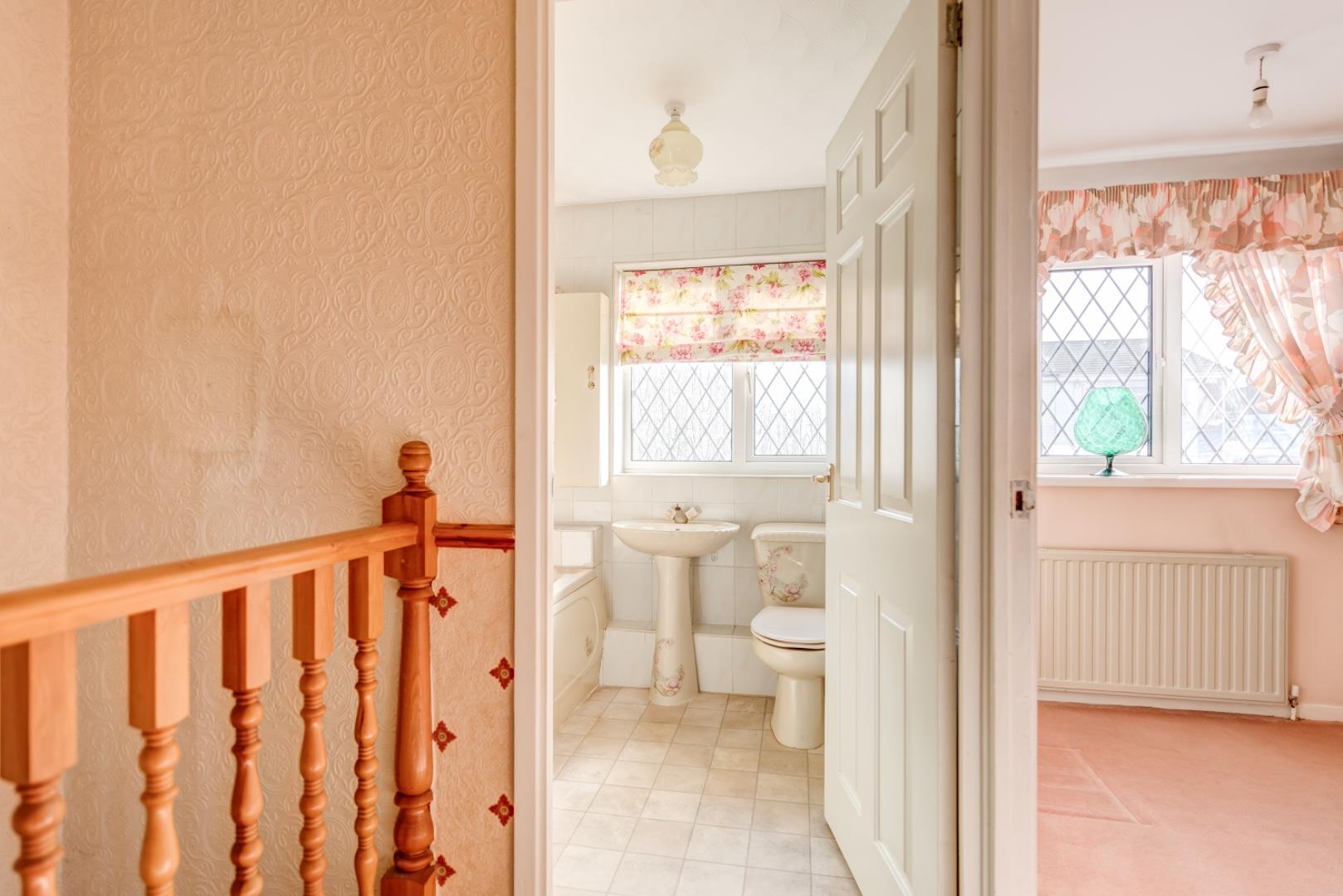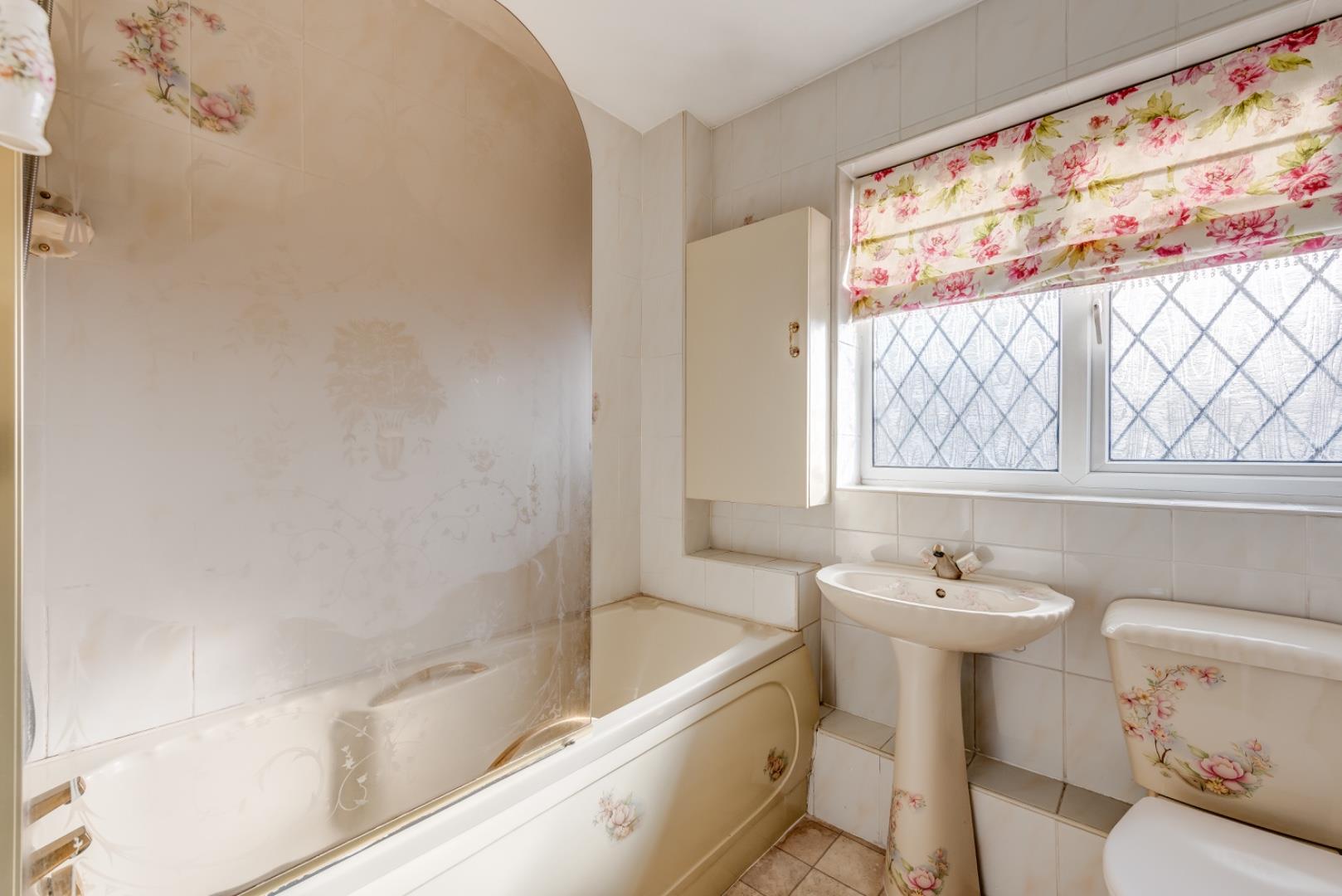 The bathroom comprises a traditional suite including a bath with tiled splash back, pedestal basin and WC. A floral patterned window blind and neutral tiling contribute to a fresh and clean look. The space is practical and comfortably sized, served by a window that provides natural light and ventilation. Shower is powered via the central heating.