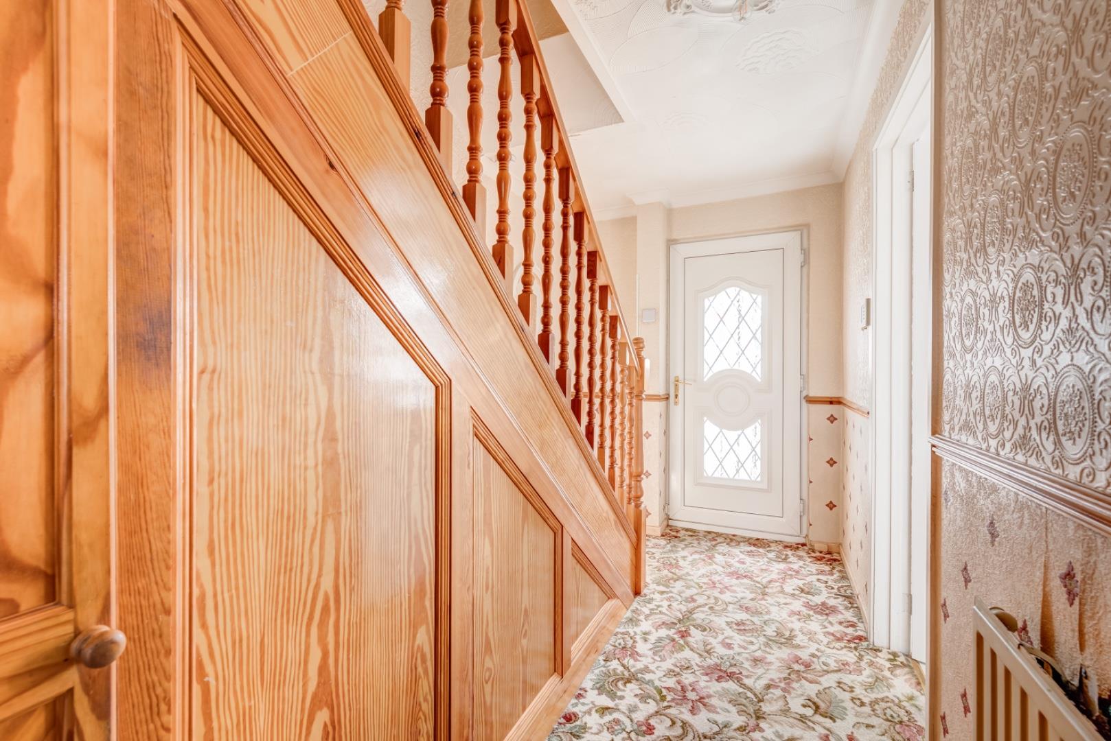 The hallway offers a warm welcome with wooden panelled staircase balustrades and fitted storage beneath the stairs. Carpeted flooring continues the homely feel, and neutral wallpaper adds subtle texture to the walls. This area connects all the ground floor rooms and leads upstairs, creating a practical and inviting entrance space.