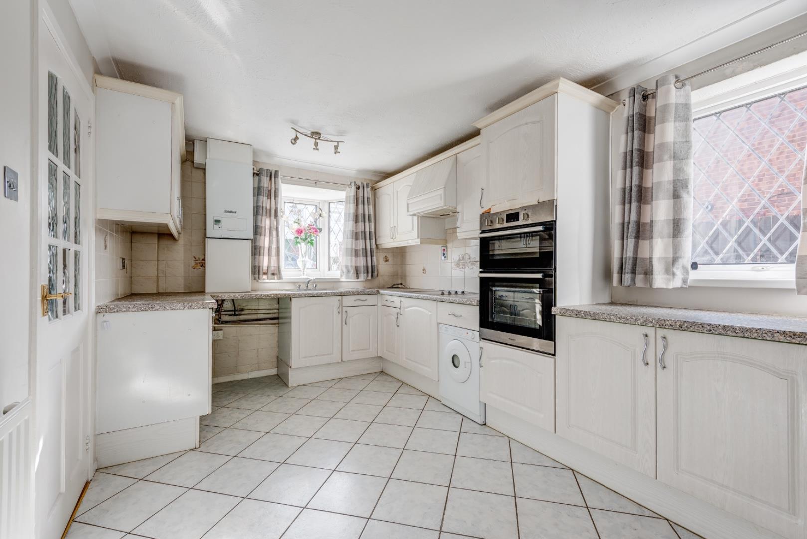The dining kitchen is bright and practical, fitted with a range of grey cabinetry and integrated appliances including an oven and hob. Ample work surfaces provide generous preparation space, complemented by tiled flooring that is easy to maintain. Natural light pours in through two windows, enhancing the room’s fresh and inviting atmosphere.