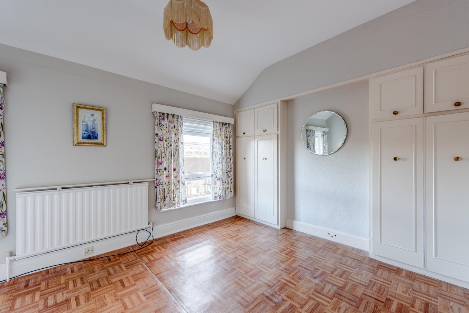 A second bedroom with built-in storage and a window looking out to the front of the property. The room features a soft carpet and neutral tones, providing a cosy and restful atmosphere.
