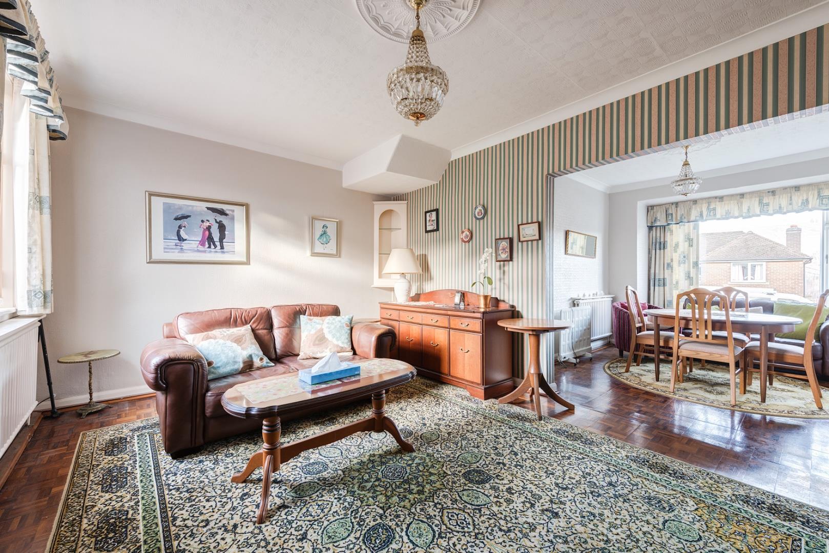A spacious lounge and dining room filled with natural light from multiple windows. The living area offers a warm setting with traditional touches such as a feature chandelier and a classic parquet floor. The dining space comfortably fits a table and chairs beneath a bay window that frames views of the street outside. The room flows seamlessly, providing a versatile space for relaxing and entertaining alike.