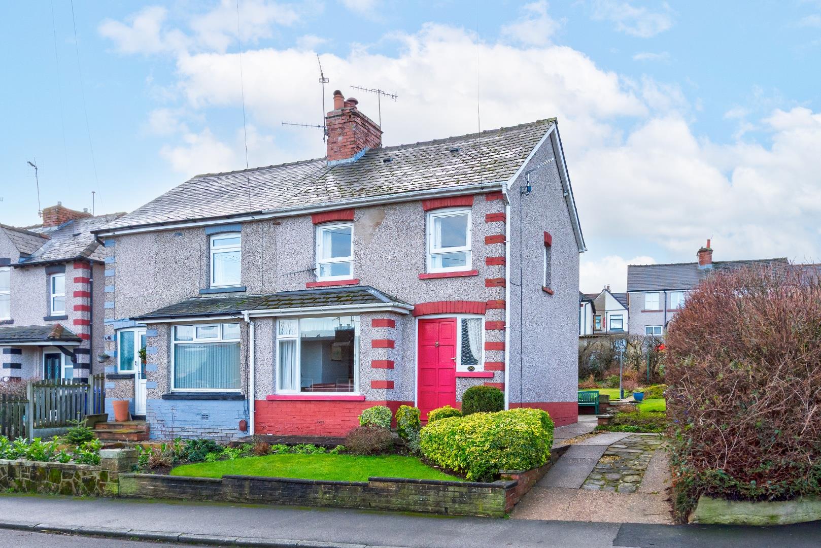 The front exterior of the property is traditional and welcoming, with a neat lawn and shrubbery in the front garden. The semi-detached home displays characterful brick detailing around the windows and a bright red front door creating a charming and inviting entrance.