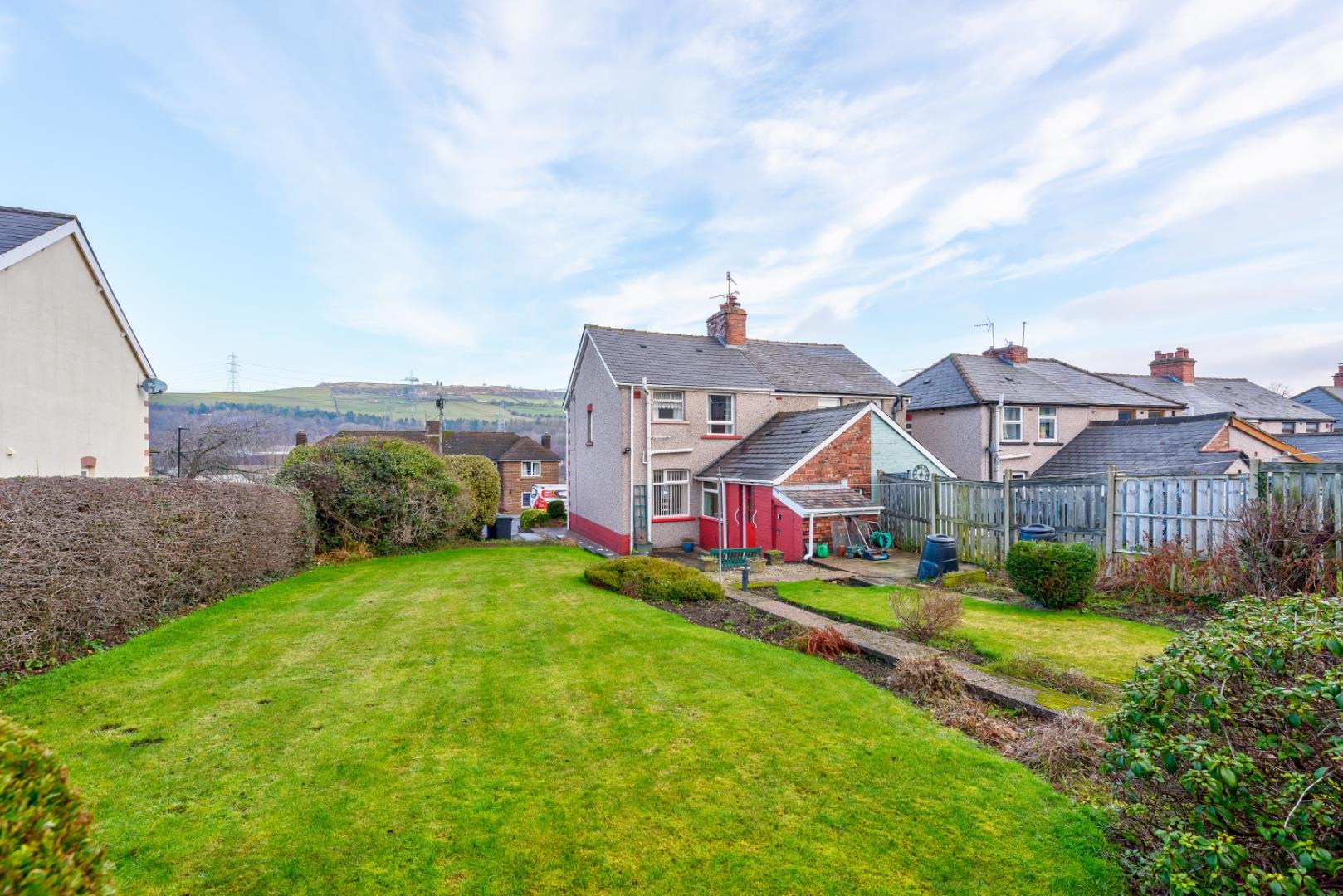 The rear garden is well-maintained and spacious, featuring a lawn bordered by established hedging and shrubbery. A paved patio area at the rear offers a pleasant space for outdoor seating and entertaining, while a garden store provides useful external storage. The garden is enclosed, providing privacy and shelter.