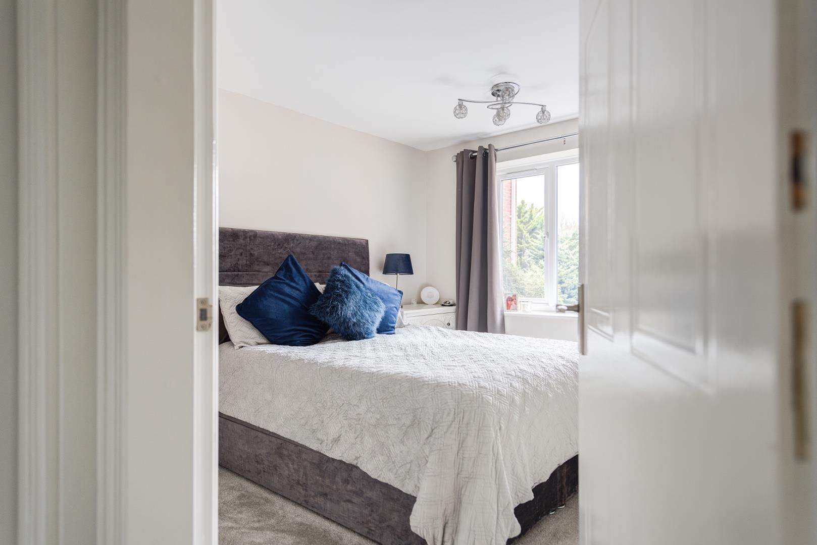 This bedroom provides a peaceful retreat, with soft grey carpeting and light walls that create a calm and restful ambience. A window allows plenty of daylight to brighten the room, and the space is well-sized to accommodate a double bed and storage furniture, offering comfort and practicality.