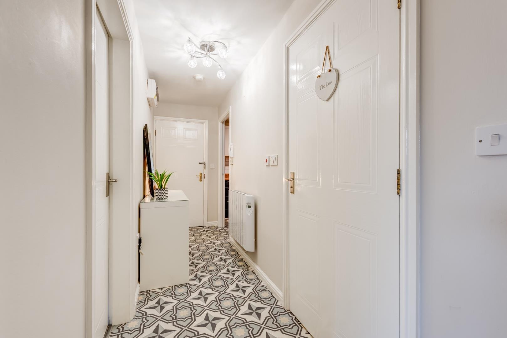 The hallway is welcoming and well lit, with stylish patterned floor tiles extending throughout. It offers ample space for furniture and decoration, helping to create a bright and inviting entrance to the home.