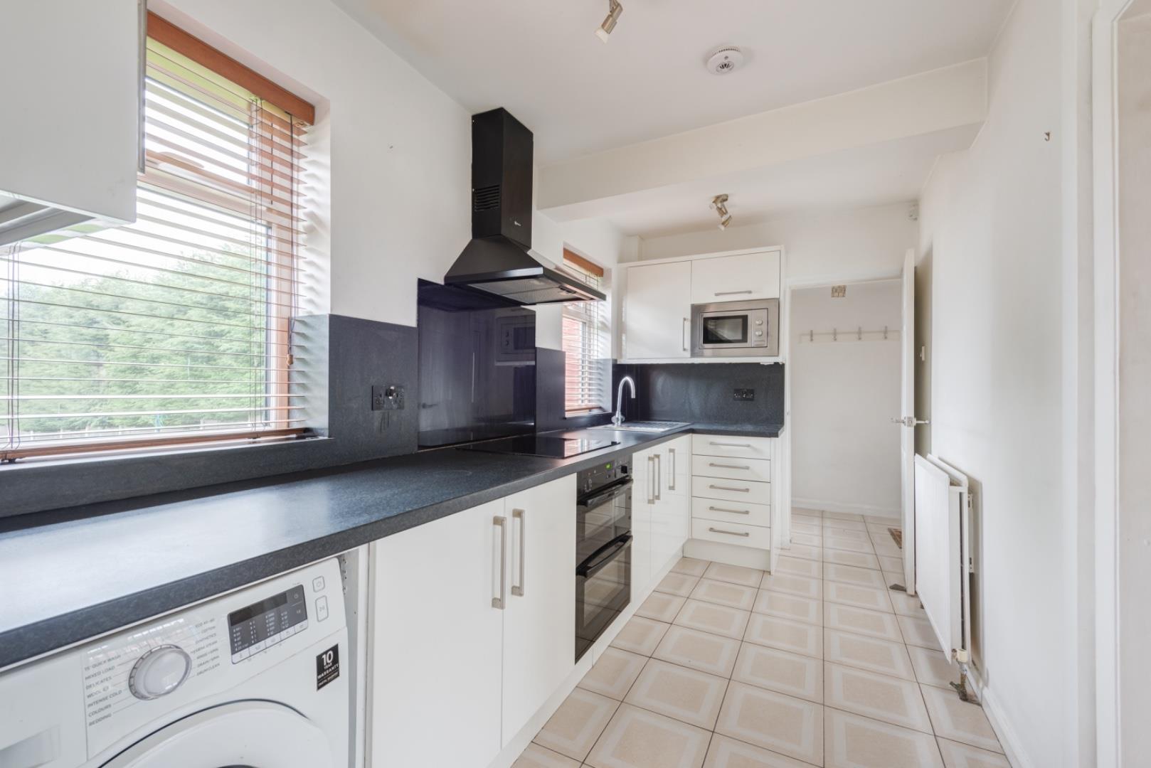 This kitchen extends up to 4.56 metres in length and is designed with a practical layout, featuring white cabinets and black countertops that contrast elegantly. Integrated appliances include a double oven, space for a washing machine, and microwave. Windows on two sides allow plenty of natural light, enhancing the bright and functional atmosphere.