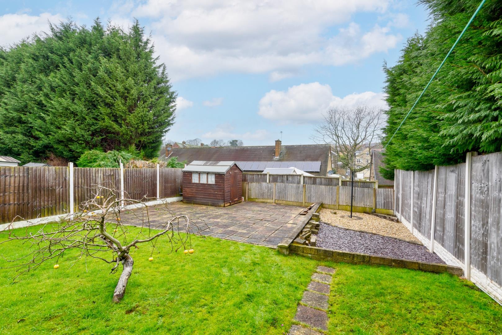 The rear garden is generously sized with a lawn bordered by fencing and mature trees providing privacy. There is a patio area ideal for outdoor seating and entertaining, alongside a shed for storage. The garden offers a pleasant green space for relaxation or family activities.
