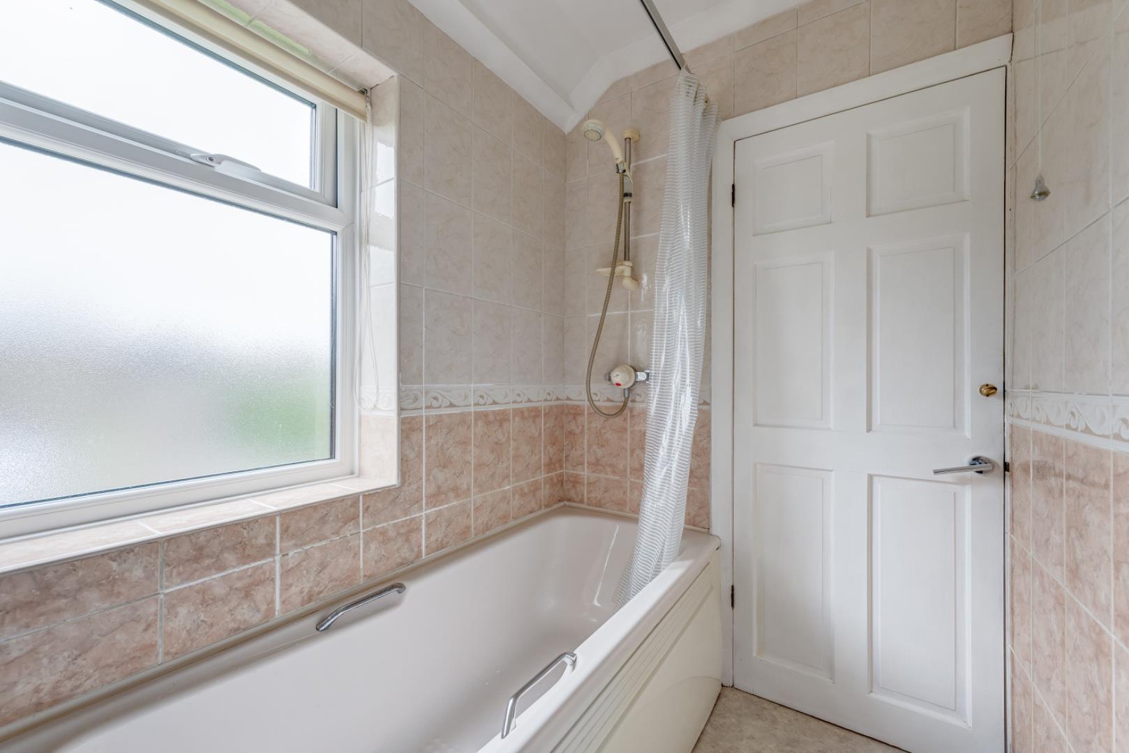 The bathroom is fully tiled with a neutral palette of beige and cream tiles. It features a bath with an overhead shower, a pedestal sink, and a WC. A frosted window provides natural light and privacy, making this a practical and clean space for daily use.