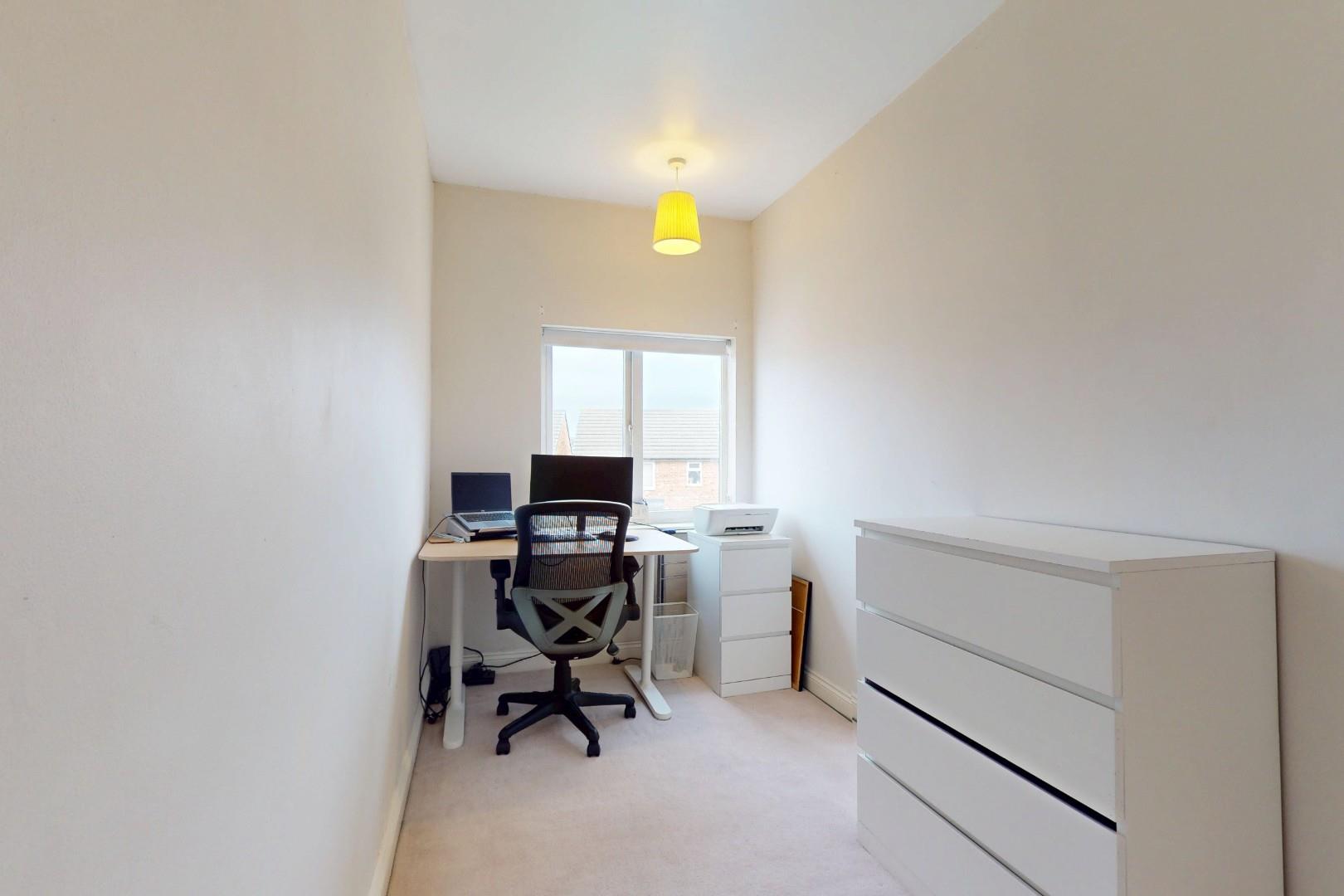 This room is currently set up as a study or home office, featuring a desk positioned in front of a window that provides natural light. The plain neutral walls and carpeted floor make it a quiet, distraction-free space ideal for work or study. Additional storage is provided by a chest of drawers, helping to keep the room tidy and organised.